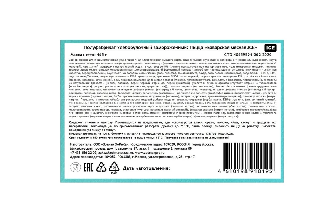 Полуфабрикат хлебобулочный замороженный: Пицца Баварская мясная.ICE Для тех, кто любит настоящую пиццу - попробуйте пиццу Zotman. Пицца Zotman - это пышное тесто из высококачественной муки, хрустящая корочка и много начинки! Приготовьте пиццу ресторанного уровня у вас дома, это легко! 1. Разогрейте духовку до 210 С. 2. Положите пиццу на решетку. 3. Выпекайте в течение 11 минут. Готово! Пицца Zotman - это высокое качество производства на каждом этапе! Приятного аппетита! Страна-производитель Россия