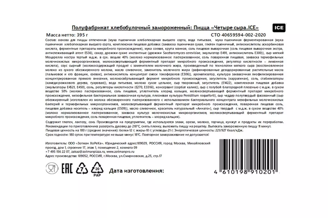 Полуфабрикат хлебобуолчный замороженный: Пицца Четыре сыра Для тех, кто любит настоящую пиццу - попробуйте пиццу Zotman. Пицца Zotman - это пышное тесто из высококачественной муки, хрустящая корочка и много начинки! Приготовьте пиццу ресторанного уровня у вас дома, это легко! 1. Разогрейте духовку до 210 С. 2. Положите пиццу на решетку. 3. Выпекайте в течение 11 минут. Готово! Пицца Zotman - это высокое качество производства на каждом этапе! Приятного аппетита! Страна-производитель Россия