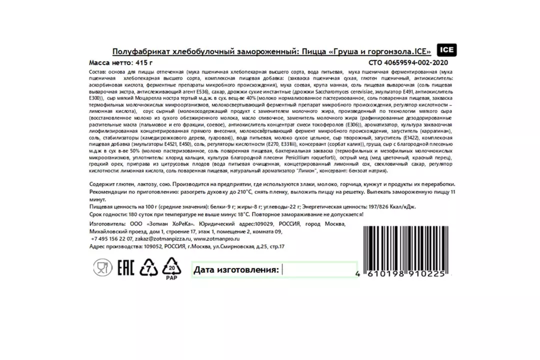 Полуфабрикат хлебобулочный замороженный: Пицца Груша и горгонзола.ICE Для тех, кто любит настоящую пиццу - попробуйте пиццу Zotman. Пицца Zotman - это пышное тесто из высококачественной муки, хрустящая корочка и много начинки! Приготовьте пиццу ресторанного уровня у вас дома, это легко! 1. Разогрейте духовку до 210 С. 2. Положите пиццу на решетку. 3. Выпекайте в течение 11 минут. Готово! Пицца Zotman - это высокое качество производства на каждом этапе! Приятного аппетита! Страна-производитель Россия