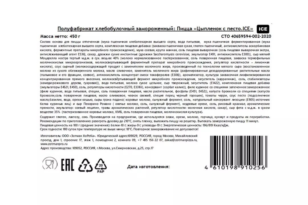 Полуфабрикат хлебобулочный замороженный: Пицца Цыпленок с песто.ICE Для тех, кто любит настоящую пиццу - попробуйте пиццу Zotman. Пицца Zotman - это пышное тесто из высококачественной муки, хрустящая корочка и много начинки! Приготовьте пиццу ресторанного уровня у вас дома, это легко! 1. Разогрейте духовку до 210 С. 2. Положите пиццу на решетку. 3. Выпекайте в течение 11 минут. Готово! Пицца Zotman - это высокое качество производства на каждом этапе! Приятного аппетита! Страна-производитель Россия
