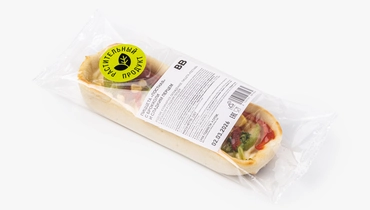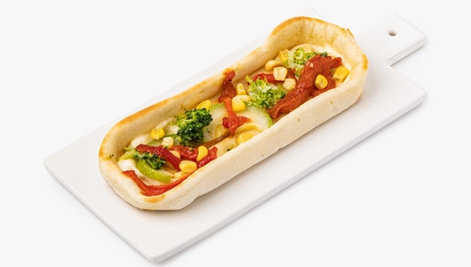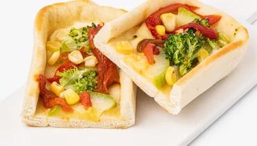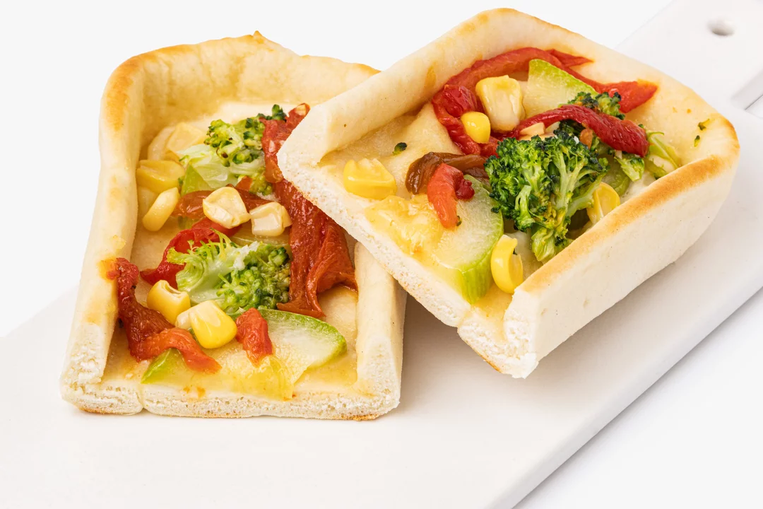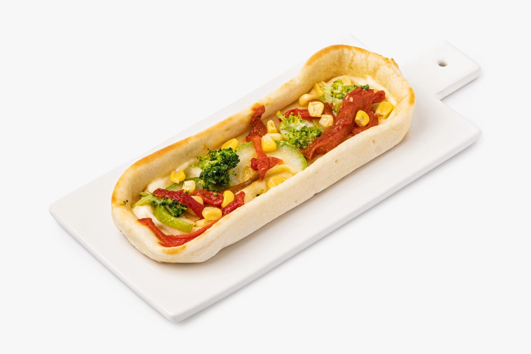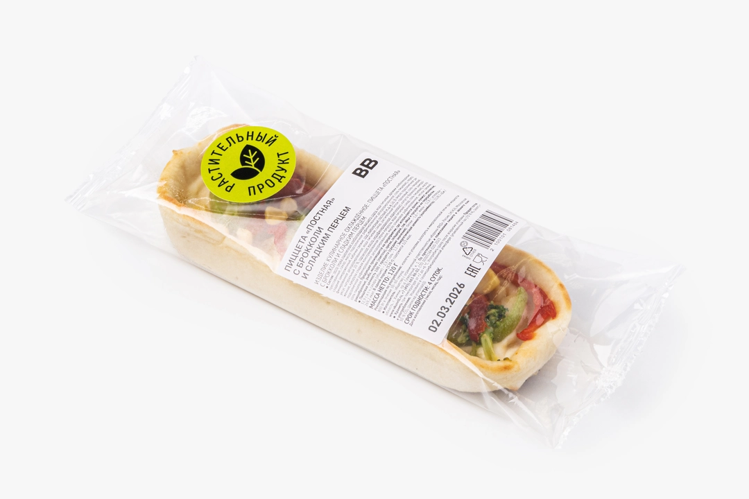 Небольшая пицца с брокколи, сладким перцем и кукурузой. Тесто приготовлено из пшеничной муки на растительном масле. В качестве соуса — постный майонез с горчичным маслом и гороховым белком. Не содержит ингредиентов животного происхождения.