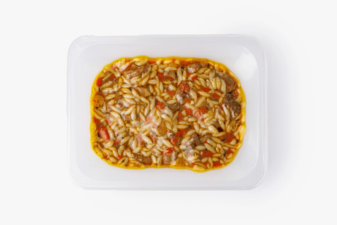 Необычная интерпретация восточного блюда с итальянскими нотками. Мелкая паста орзо из твёрдых сортов пшеницы сохраняет форму и впитывает все соки куриного бедра, а обжаренные лук и морковь придают мягкую сладость. Барбарис добавляет характерную кислинку, зира вносит пряную восточную нотку, а куркума придаёт золотистый оттенок. Светлый изюм даёт лёгкий контраст — чуть сладкий штрих, уравновешивающий специи. Получается сытный обед с атмосферой восточного базара в каждой ложке.