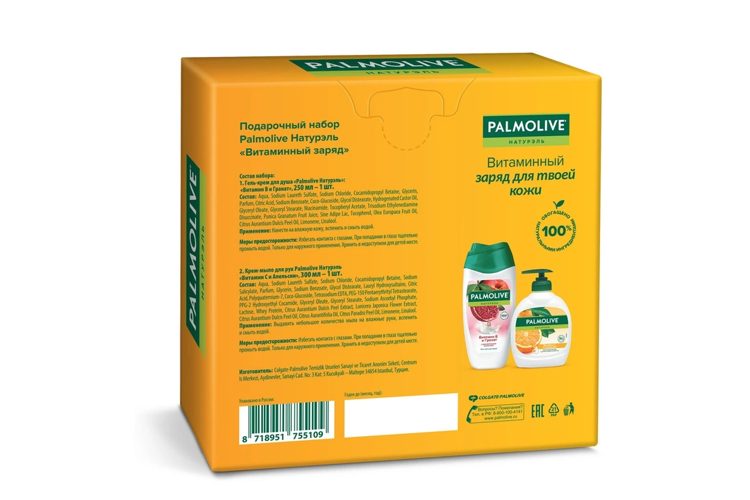Подарочный набор Palmolive Натурэль Витаминный заряд. Состав набора: - Гель-крем для душа Palmolive Натурэль: Витамин В и Гранат, 250 мл, - Крем-мыло для рук Palmolive Натурэль Витамин C и Апельсин, 300 мл. Гель-крем для душа и жидкое крем-мыло для рук с витаминами, известными своими антиоксидантными свойствами: Витамин B защищает кожу от сухости и замедляет ее старение, а Витамин C придает коже тонус. Увлажняющее молочко в составе продуктов Palmolive Натурэль дарит коже ощущение мягкости, а ароматы сочного апельсина и приятные сладковатые нотки с мягкой терпкой кислинкой граната дарят заряд хорошего настроения после каждого применения. Витаминный заряд для твоей кожи от Palmolive! Продукты линейки Palmolive Натурэль: - Содержат 100% натуральные экстракты; - Не содержат парабенов и силиконов, а PH-нейтральная очищающая формула геля для душа бережно заботится о Вашей коже; - Имеют перерабатываемую упаковку**; - Произведены в Турции, соответствуют международным стандартам качества. Palmolive - для гармонии души и тела. Упаковано в России, комплектующие - Турция.