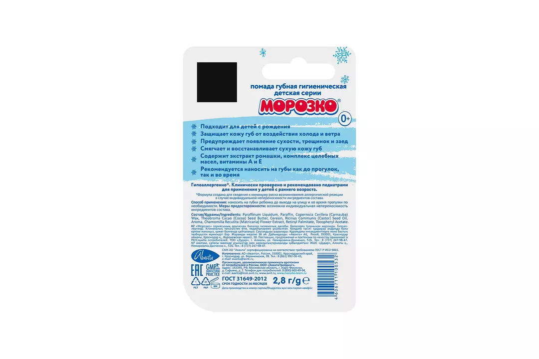 Помада Морозко подходит для детей с рождения. Защищает кожу губ от воздействия холода и ветра. Предупреждает появление сухости, трещинок и заед. Смягчает и восстанавливает сухую кожу губ. Содержит экстракт ромашки, комплекс целебных масел, витамины А и Е . Рекомендуется наносить помаду на губы как до прогулок, так и во время. Гипоаллергенно*. Клинически проверено и рекомендовано педиатрами для применения у детей с раннего возраста. *Формула помады создана для сведения к минимуму риска аллергической реакции в случае индивидуальной непереносимости ингредиентов состава. РОССИЯ