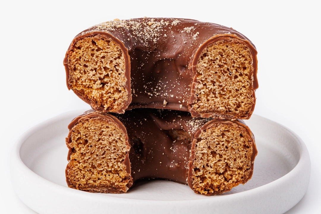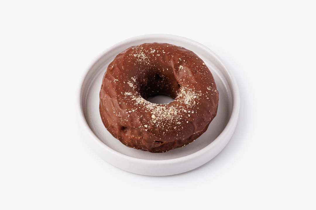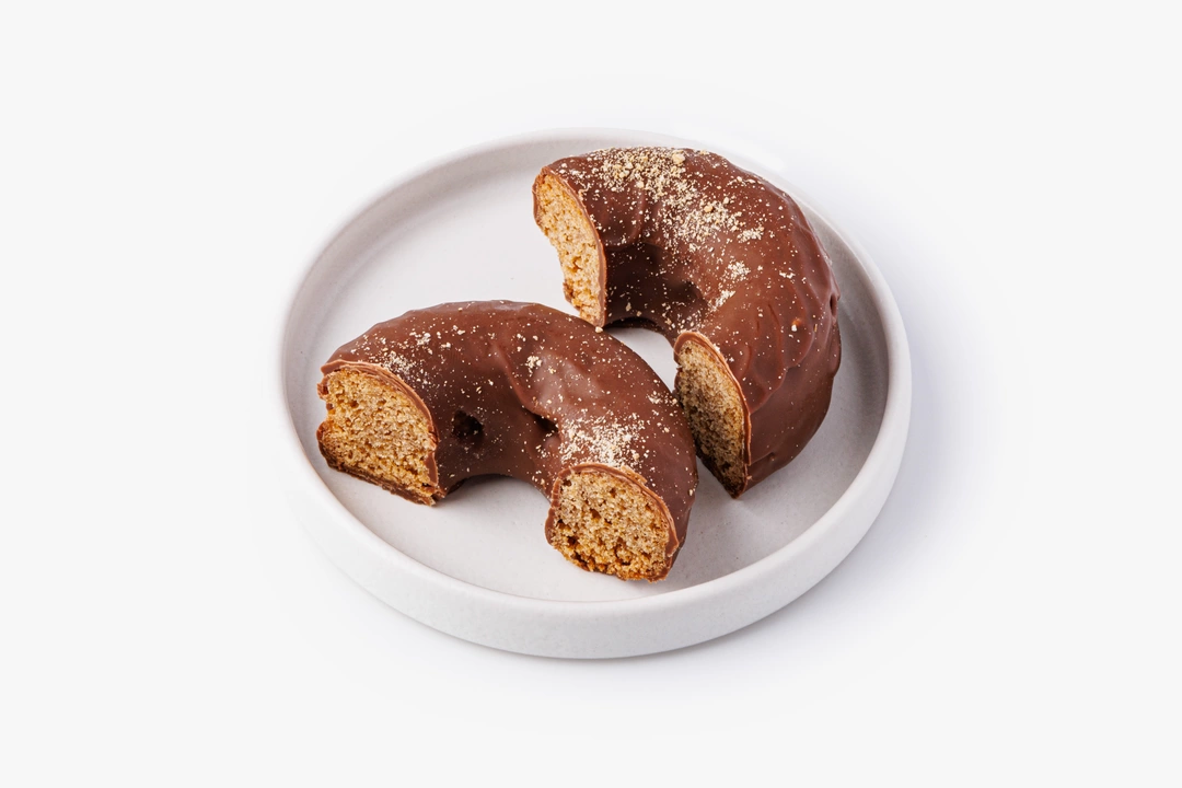 Пончик из безглютеновой муки с семенами гречихи и шоколадной глазурью. Рисовая, амарантовая и льняная мука сочетаются с нерафинированным кокосовым маслом и кокосовым сахаром. Глазурь на какао-масле и тертом какао придаёт насыщенный вкус.
