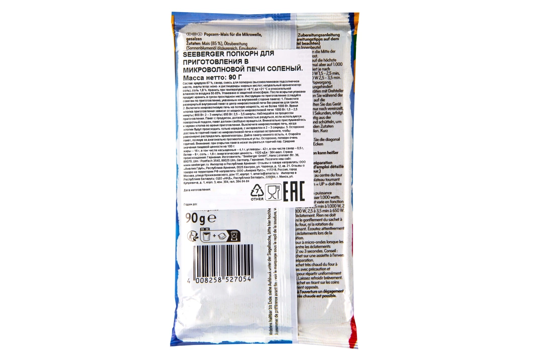 Попкорн Seeberger Salted popcorn соленый для микроволновой печи 90 г / Супермаркет