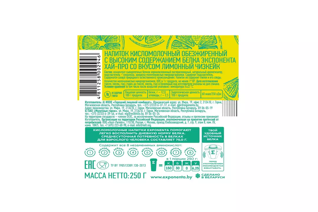 Продукт кисломолочный Exponenta High-Pro со вкусом лимонный чизкейк обезжиренный 250 г / Супермаркет