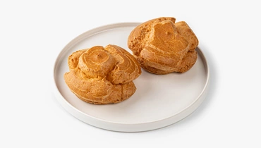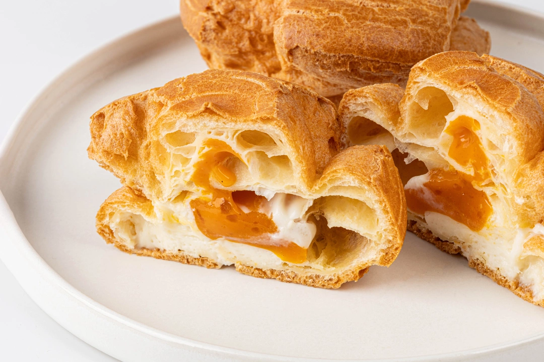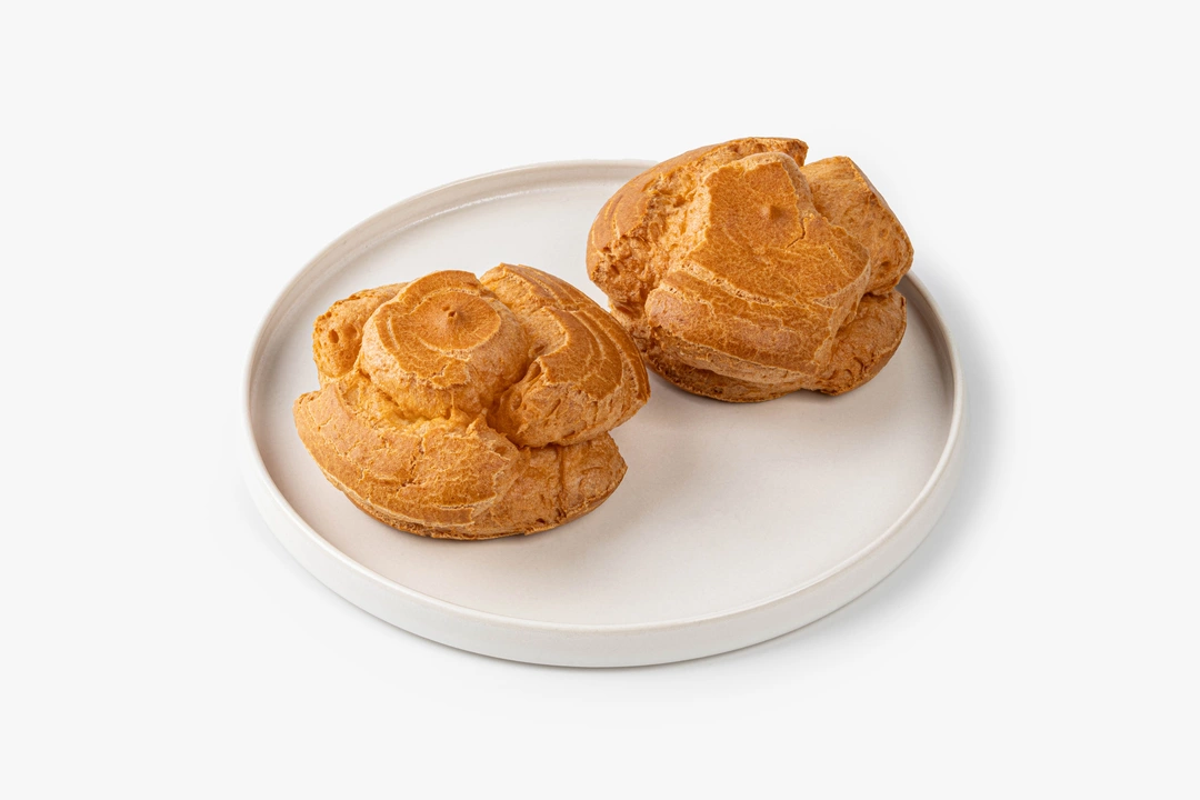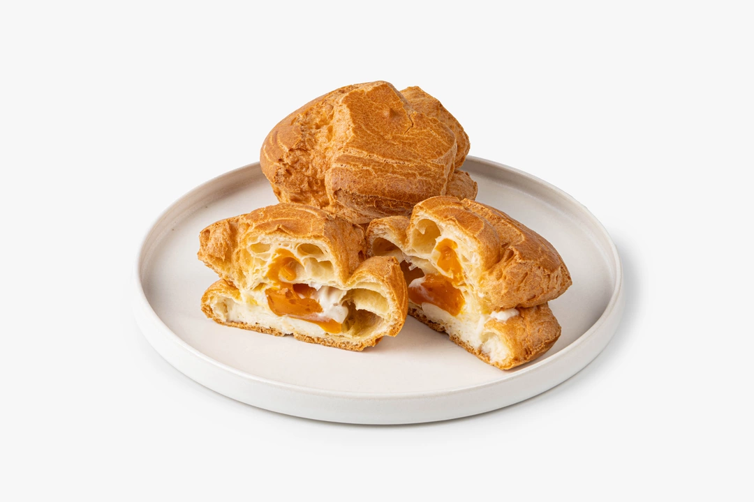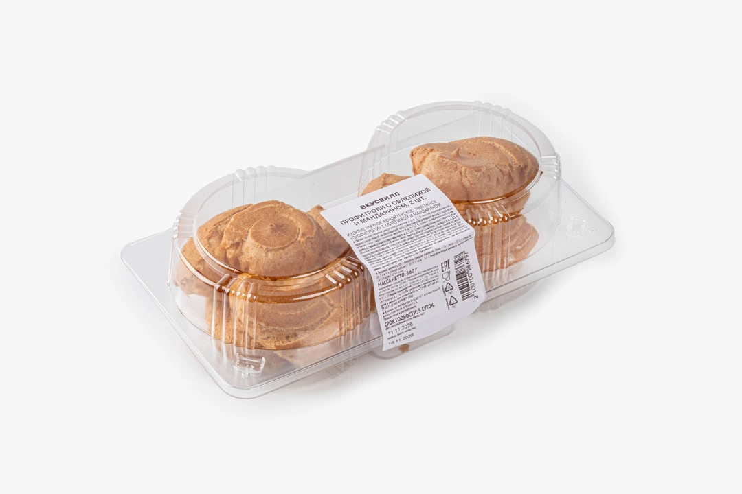 Заварные профитроли, наполненные кремом на основе сливок и сгущённого молока с добавлением облепихового и мандаринового пюре. Формат — два небольших пирожных для десерта или перекуса.