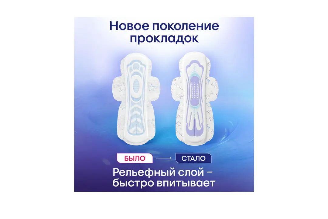 Прокладки ночные для обильных выделений с удлинённой формой и защитой по краям. Впитывающий центр с технологией Fast Absorb быстро принимает влагу и равномерно распределяет её по всей прокладке. Боковые и задний барьеры удерживают жидкость внутри, не давая ей растекаться, даже в положении лёжа. Форма гибкая, повторяет движения тела, прокладка плотно прилегает и не смещается. Верхний слой с мягкой сеточкой пропускает влагу и остаётся сухим. Степень впитывания 6 капель. Страна производитель-Чехия
