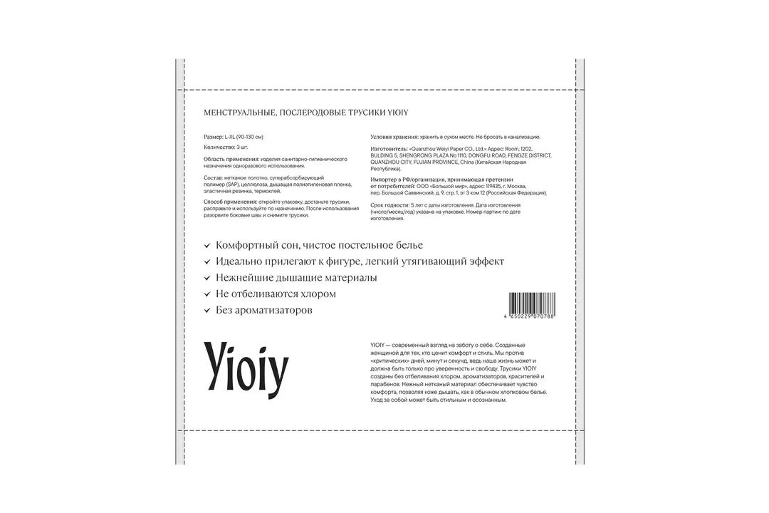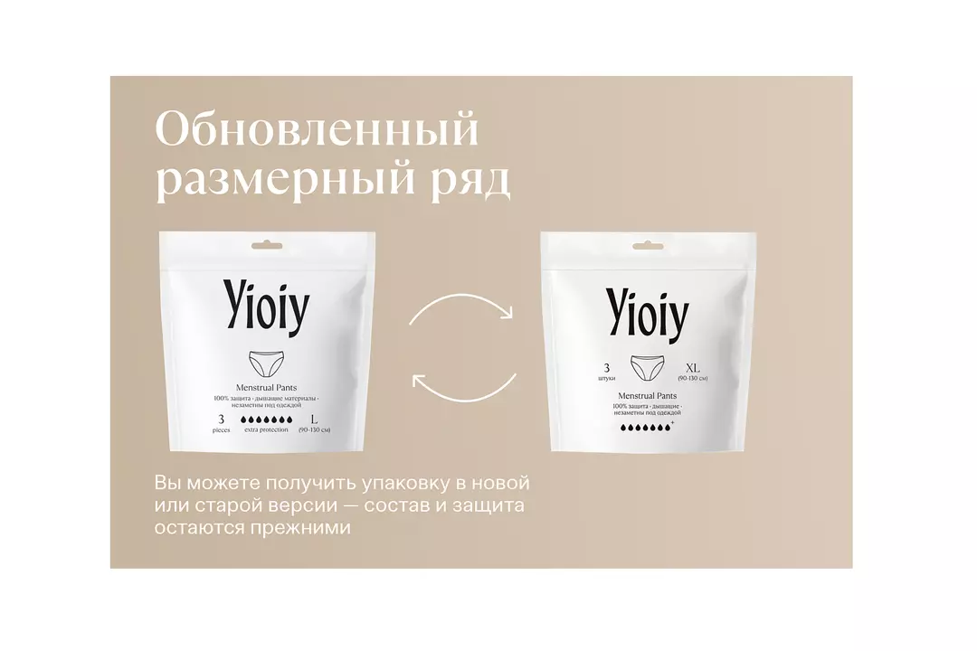 YIOIY - современный взгляд на заботу о себе. Созданные женщиной для тех, кто ценит комфорт и стиль. Мы против «критических» дней, минут, секунд, ведь наша жизнь может и должна быть только про уверенность и свободу. Одноразовые впитывающие менструальные, послеродовые трусы Yioiy - универсальный и незаменимый продукт, его можно использовать при менструациях, взять с собой в роддом, использовать их как ночные трусы. Также данное изделие способно заменить дневные и ночные прокладки гигиенические. (особенно при обильных выделениях) и гигиенически прокладки послеродовые и трусы сетчатые одноразовые (после родов). Обновленный размерный ряд: вы можете получить упаковку в новой или старой версии — состав и защита остаются прежними. Тип покрытия - мягкое покрытие Страна производитель-Китай