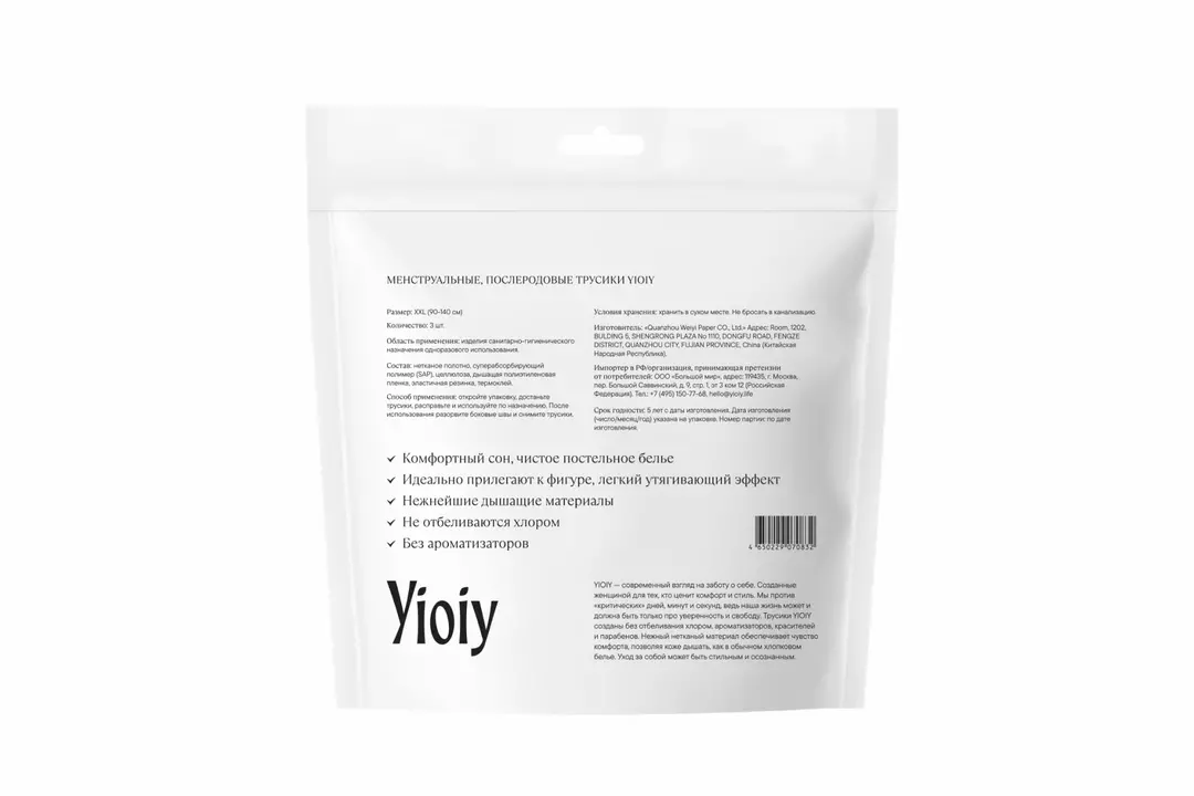 Yioiy (Йóйи) – современный взгляд на заботу о себе. Одноразовые впитывающие менструальные, послеродовые трусы, для тех, кто ценит комфорт, уверенность, стиль и свободу. Универсальное решение: - во время обильных менструаций, - в качестве ночного белья, - сразу после родов или в послеродовой период. Без смещения, протеканий и дискомфорта. Вы можете получить упаковку в новой или старой версии дизайна. Состав и защита остаются прежними. Тип покрытия: мягкое Страна производства: Китай
