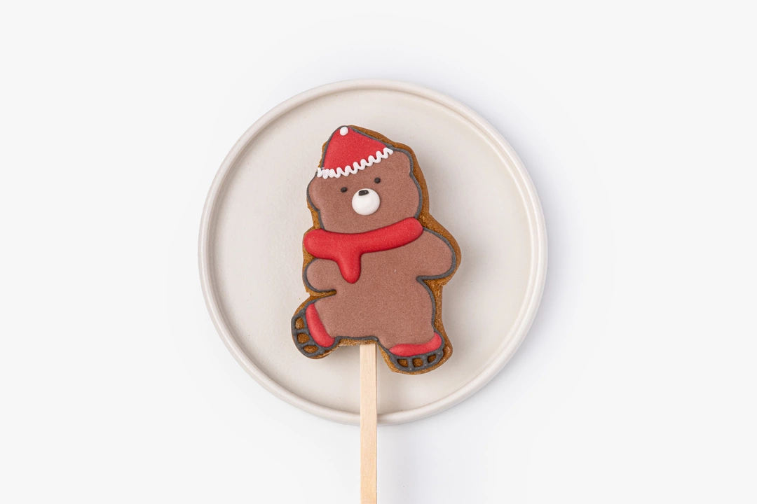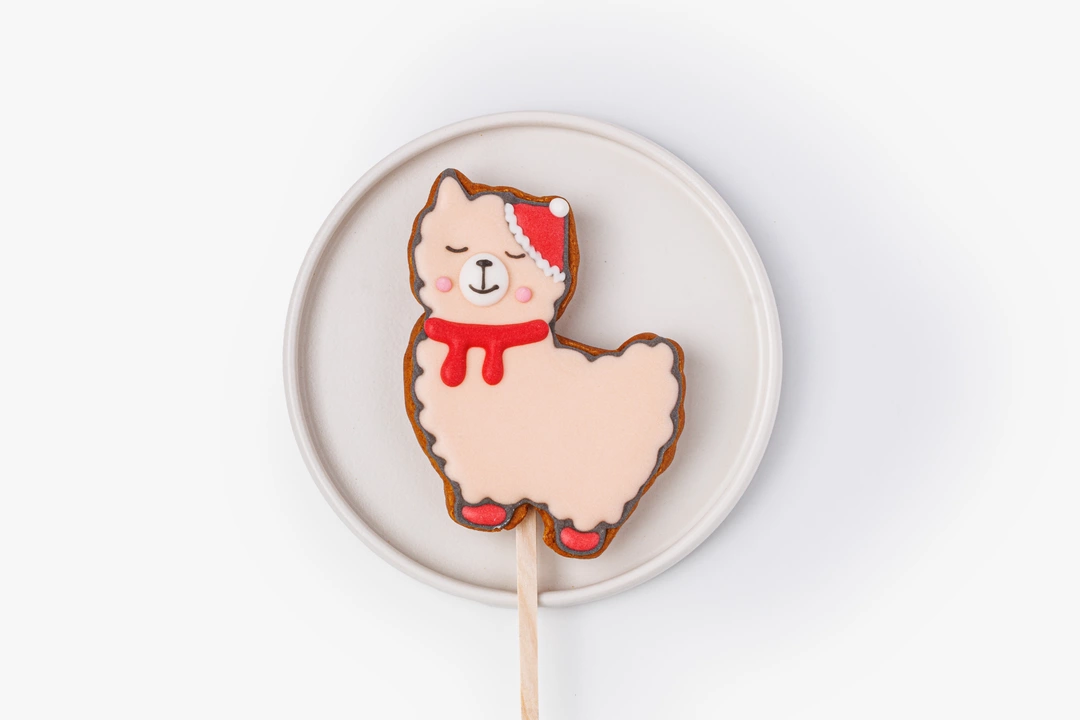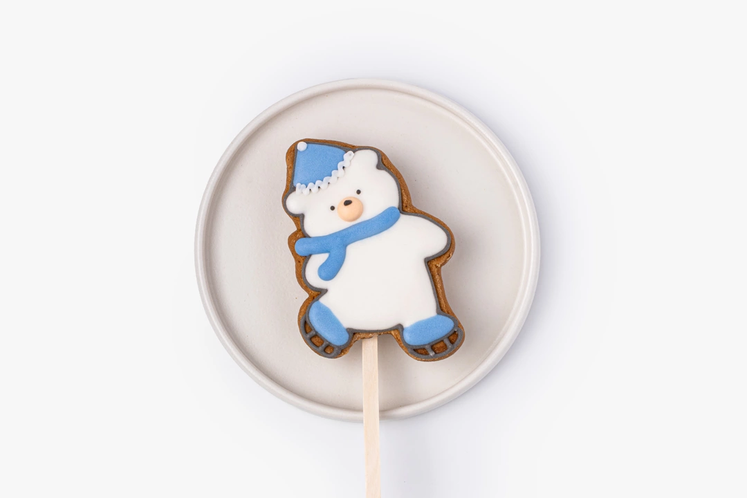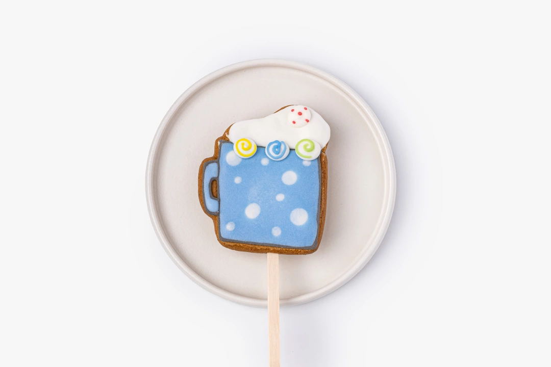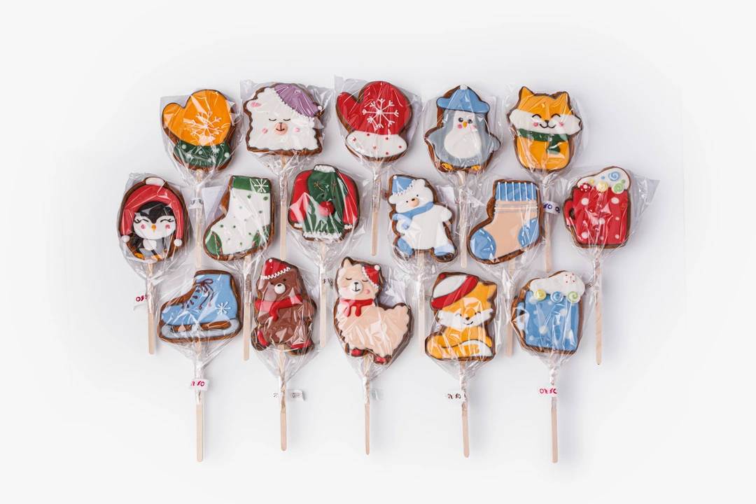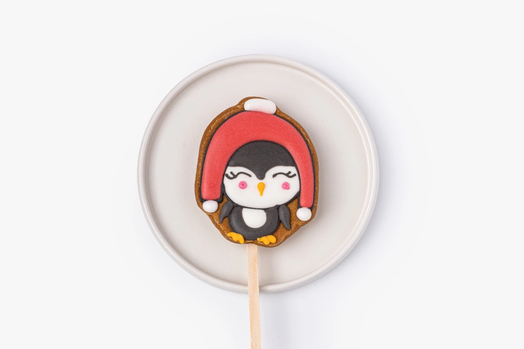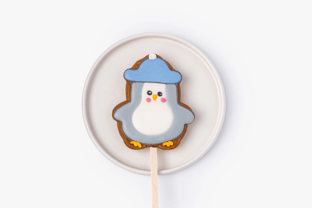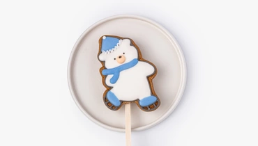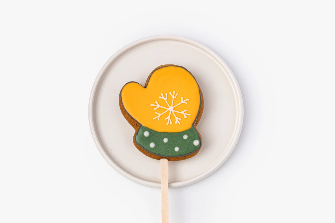 Этот имбирный пряник на палочке украшен глазурью с зимними мотивами. В тесте чувствуется тёплое сочетание имбиря, корицы, кардамона и мускатного ореха. Оно имеет плотную, но нежную текстуру, а сахарная глазурь добавляет лёгкую сладость. Палочка делает угощение удобным — можно наслаждаться, не пачкая пальцы. Пряник хорошо сочетается с чаем или какао, создавая уютное настроение в холодные дни. Можно подарить вместо открытки, украсить им сладкий стол или добавить к подарку как небольшой зимний комплимент.