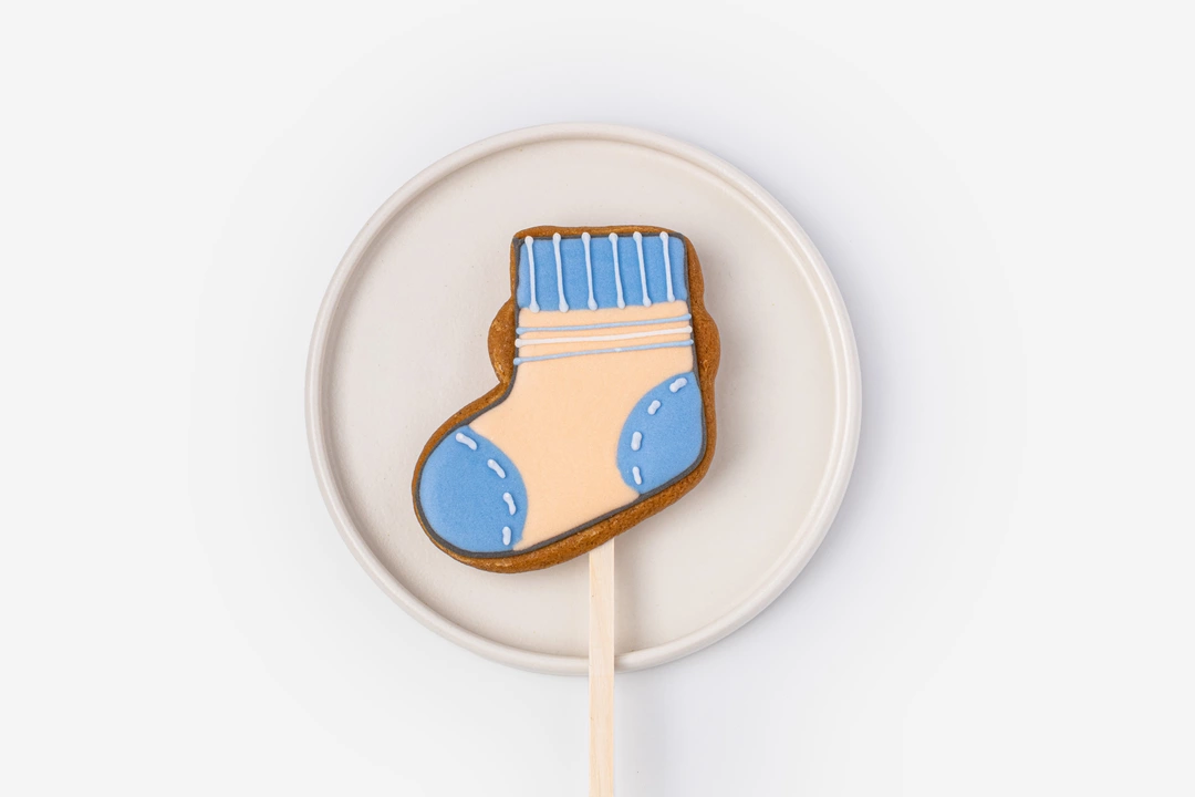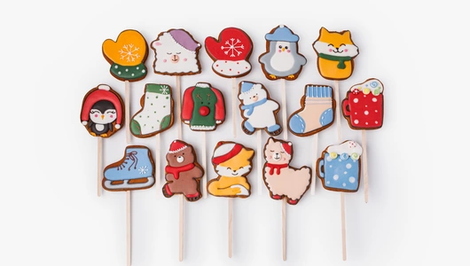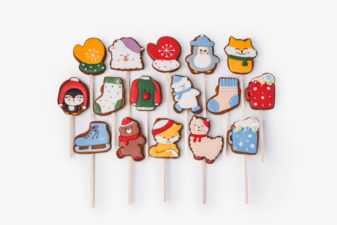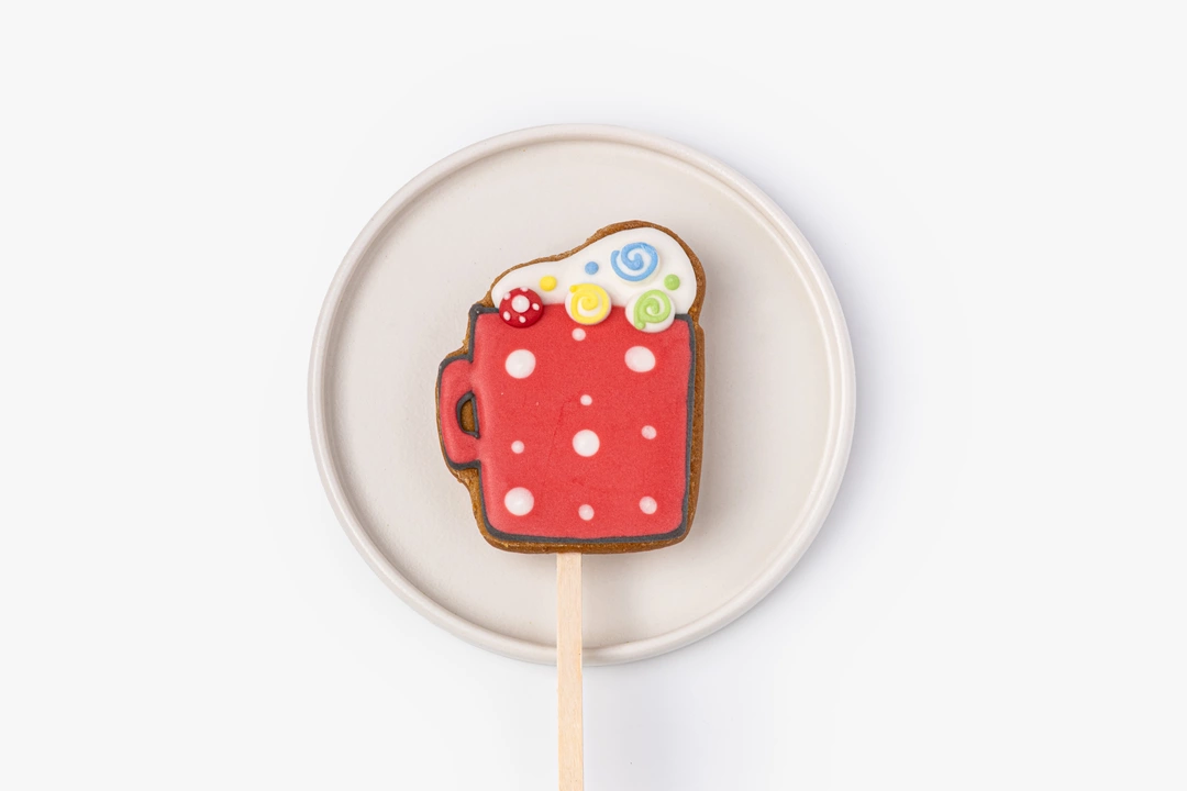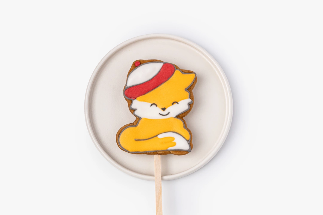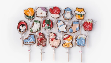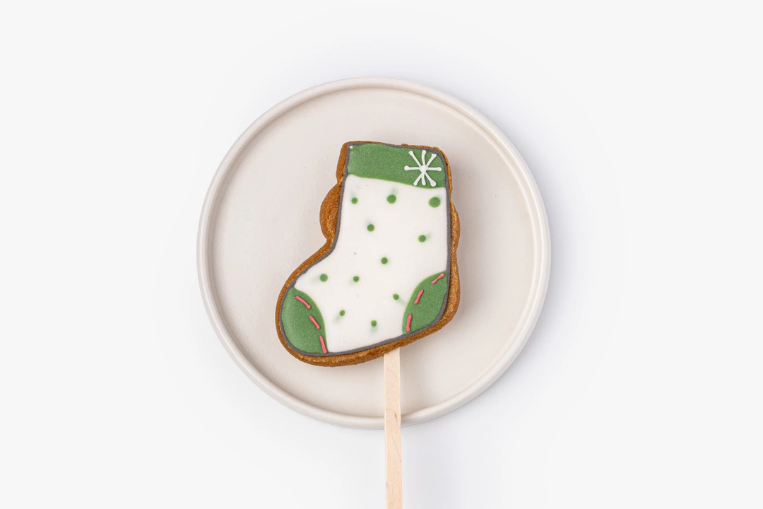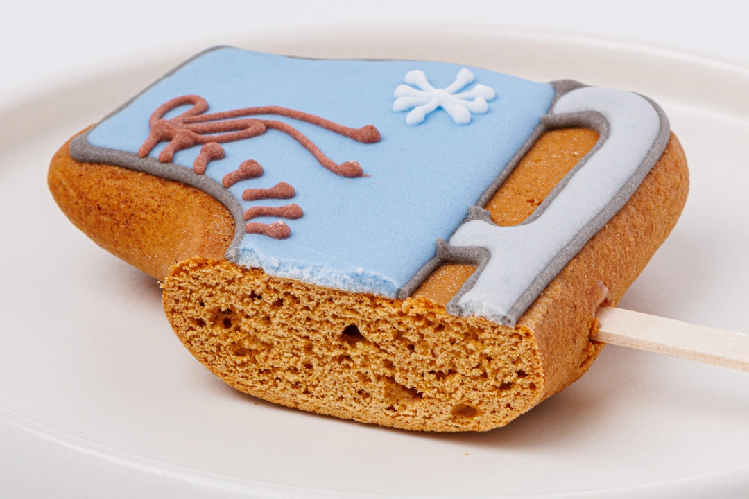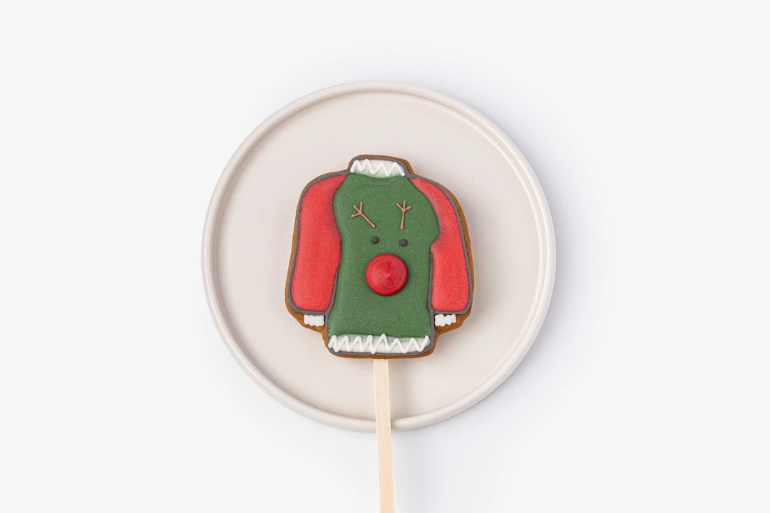 Этот имбирный пряник на палочке украшен глазурью с зимними мотивами. В тесте чувствуется тёплое сочетание имбиря, корицы, кардамона и мускатного ореха. Оно имеет плотную, но нежную текстуру, а сахарная глазурь добавляет лёгкую сладость. Палочка делает угощение удобным — можно наслаждаться, не пачкая пальцы. Пряник хорошо сочетается с чаем или какао, создавая уютное настроение в холодные дни. Можно подарить вместо открытки, украсить им сладкий стол или добавить к подарку как небольшой зимний комплимент.
