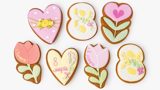 Пряник с мягкой медовой текстурой и тёплым букетом специй. Цветочный мёд и сливочное масло делают основу нежной, а цедра апельсина добавляет лёгкую цитрусовую свежесть. Имбирь, корица, кардамон и мускатный орех создают согревающий пряный аромат, который постепенно раскрывается. Сахарная глазурь с натуральными красителями придаёт прянику нежные пастельные тона в духе весеннего настроения.