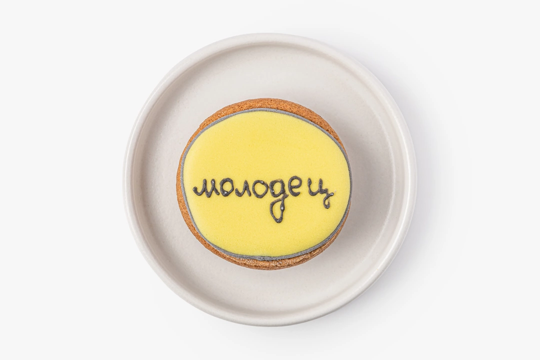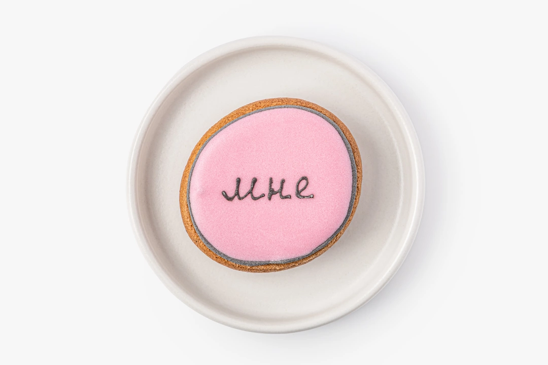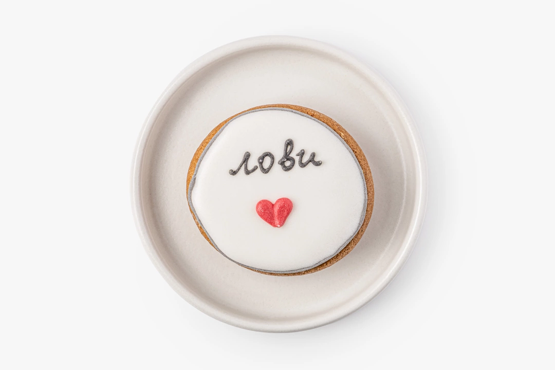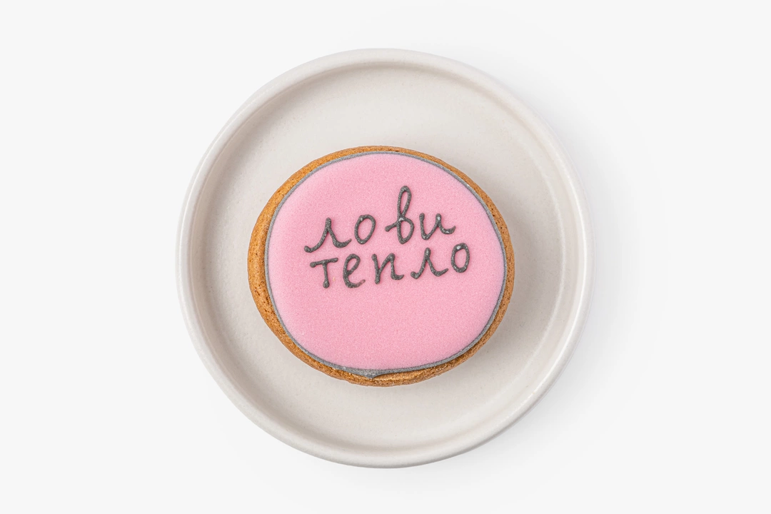 Миниатюрный имбирный пряник с тёплыми специями. В основе — классическое пряничное тесто на сливочном масле с корицей, имбирём, мускатным орехом и кардамоном. Покрыт гладкой сахарной глазурью, для окрашивания которой используются натуральные растительные экстракты.