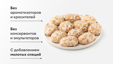 Мы выпекаем пряники из ржаной обдирной и пшеничной муки первого сорта с добавлением подсолнечного масла. Мягкий, классический десерт с насыщенным ароматом молотых гвоздики, корицы и кориандра.