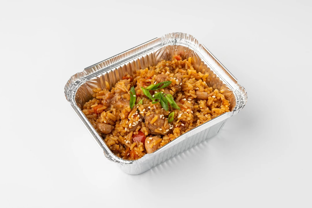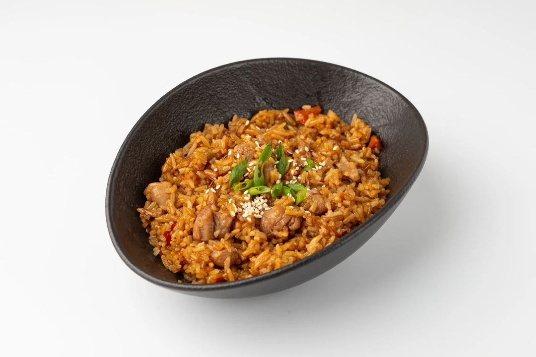 Аппетитное блюдо, в основе которого отварной рис, обжаренный с куриным филе, мозайкой из сладкой моркови, болгарского перца и сочных кабачков, сдобренная соусом терияки, придающий пряность и пикантность вкуса.