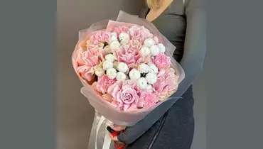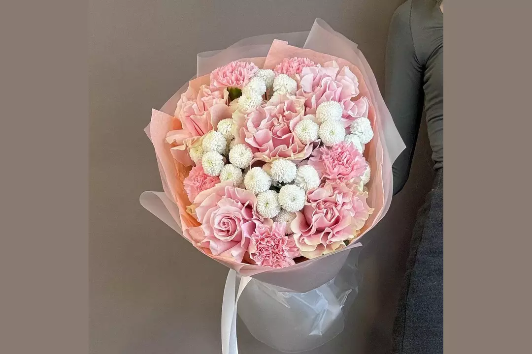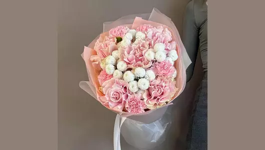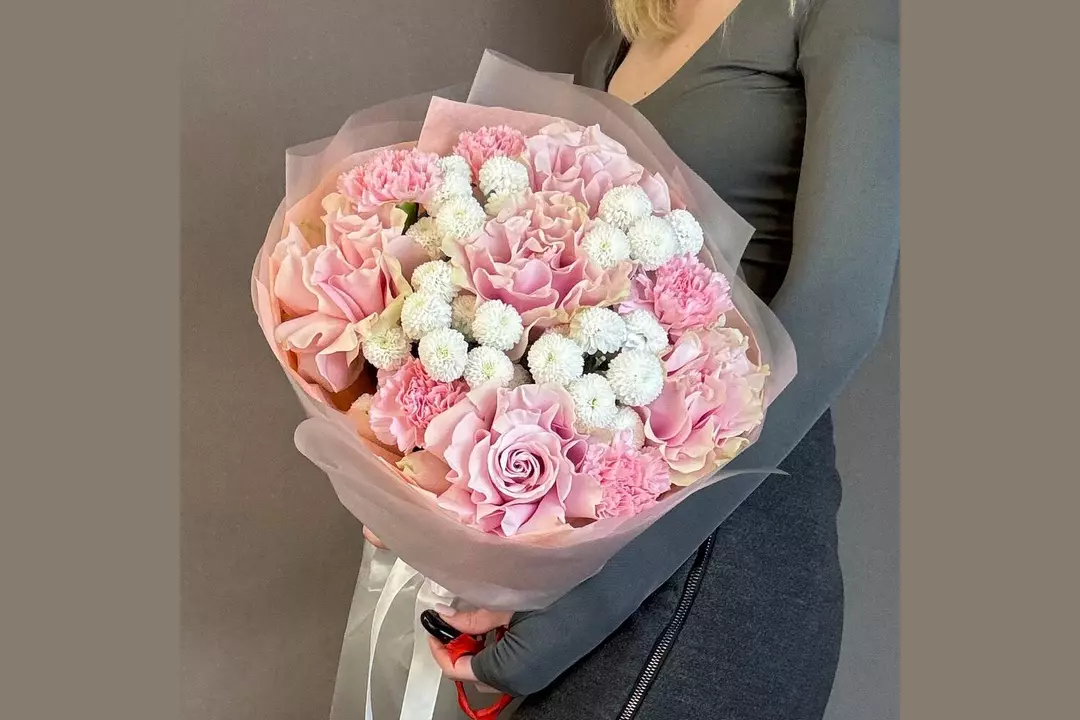 Хризантема кустовая - 4 шт. Роза - 5 шт. Гвоздика - 5 шт. Лента атласная - 1 шт. Тишью - 1 шт. Пленка матовая - 2 шт.