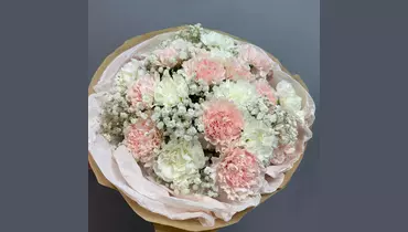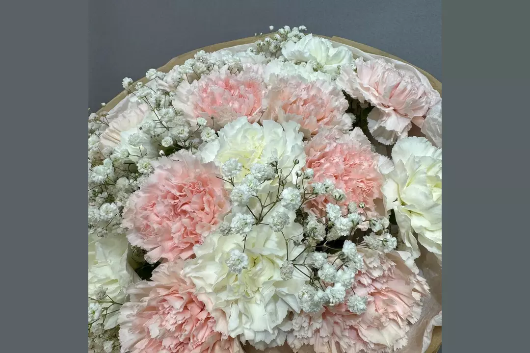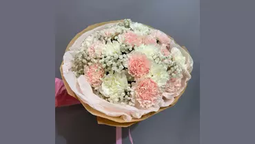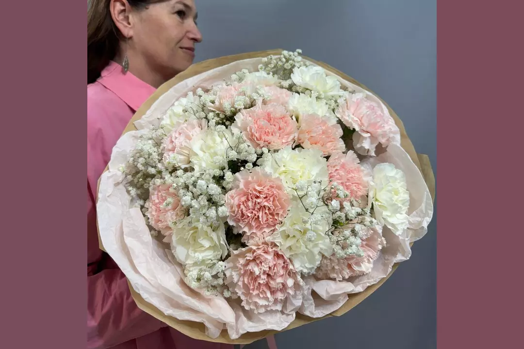 Нежный и пышный букет с невероятно стойким составом! Попадание в любой запрос девушки. Состав: Гипсофила - 3 шт. Гвоздика розовая - 11 шт. Тишью - 1 шт. Гвоздика белая - 8 шт. Крафт - 1 шт.