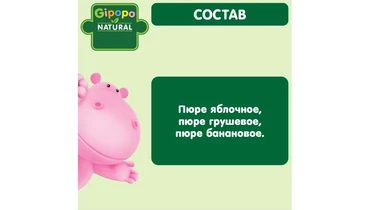 Детское фруктовое пюре GIPOPO в удобной упаковке - пауче подходят для питания малышей с 6 месяцев. В состав «Фруктового салатика» GIPOPO входят пюре из яблок, груш и бананов. Фрукты разнообразят рацион малыша, познакомят его с новыми вкусами. Для пюре мы отбираем сочные и спелые фрукты, которые позволяют получить необходимые витамины и минералы. Детские фруктовые пюре GIPOPO: - Без добавления сахара - Без консервантов, красителей, ГМО - Удобная мягкая упаковка-пауч Пюре в мягкой упаковке дополняет рацион в процессе взросления – удобно взять с собой. Попробуйте также овощные, мясные и мясорастительные пюре GIPOPO. Создано экспертами, одобрено мамами. Страна производитель-Россия