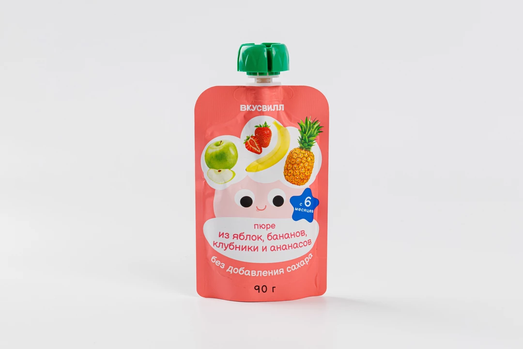 Пюре из яблок, бананов, клубники и ананасов, 90 г