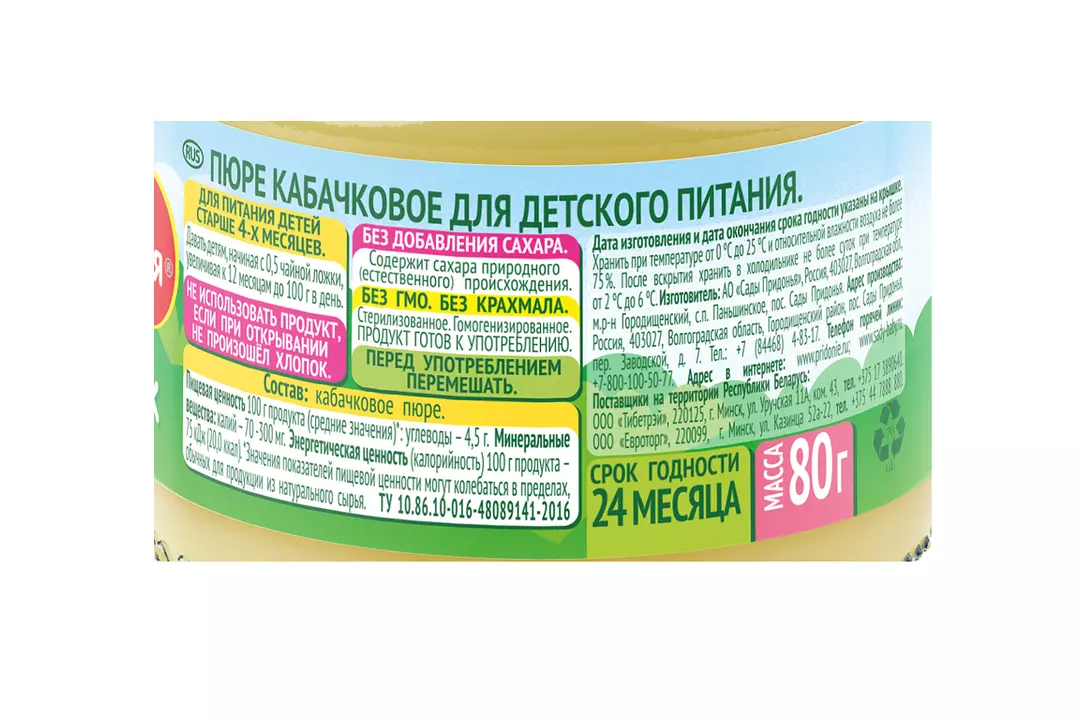 Пюре овощное Сады Придонья кабачок с 4 месяцев 80 г / Супермаркет