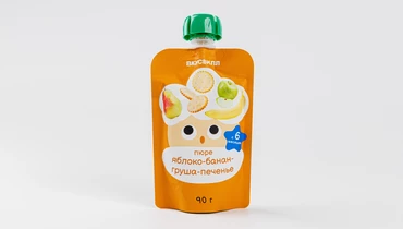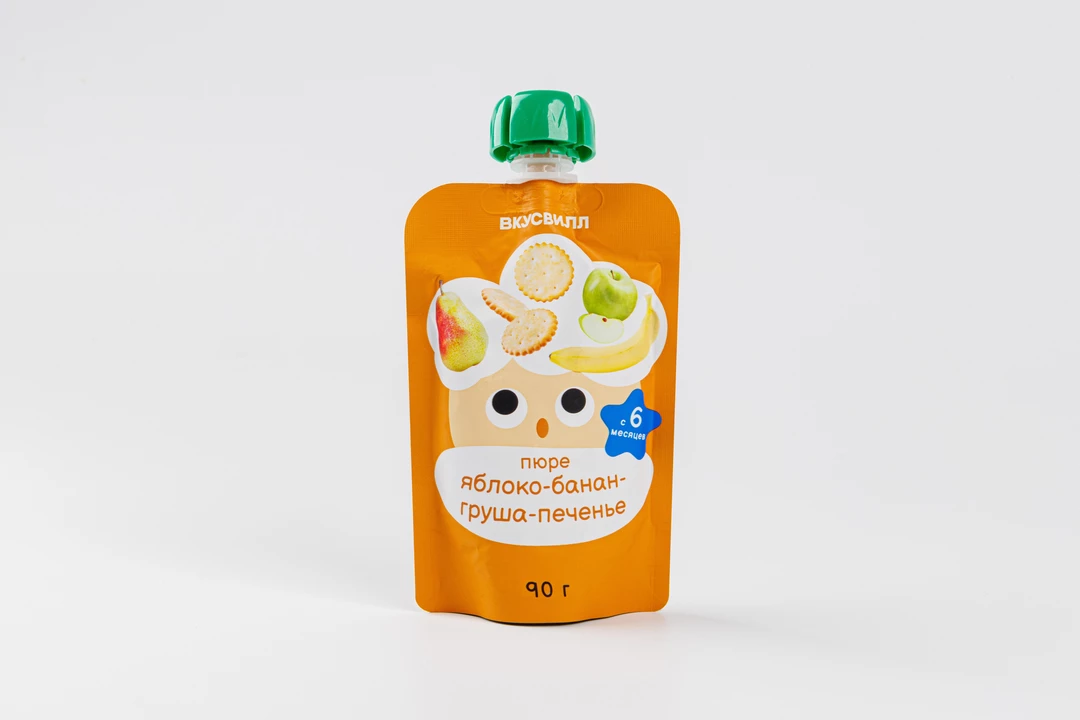 Микс из пюре яблока, банана и груши. А для особого сливочного вкуса мы добавили крошку печенья, выпеченного на сухом молоке. Умеренно сладкое, с нежной консистенцией, оно понравится как малышам, так и детям постарше. Герметичная упаковка позволяет брать пюре с собой в дорогу или на прогулку. Благодаря горлышку небольшого размера малыш учится кушать сам и реже пачкает одежду. Пюре подходит для детей с 6 месяцев.