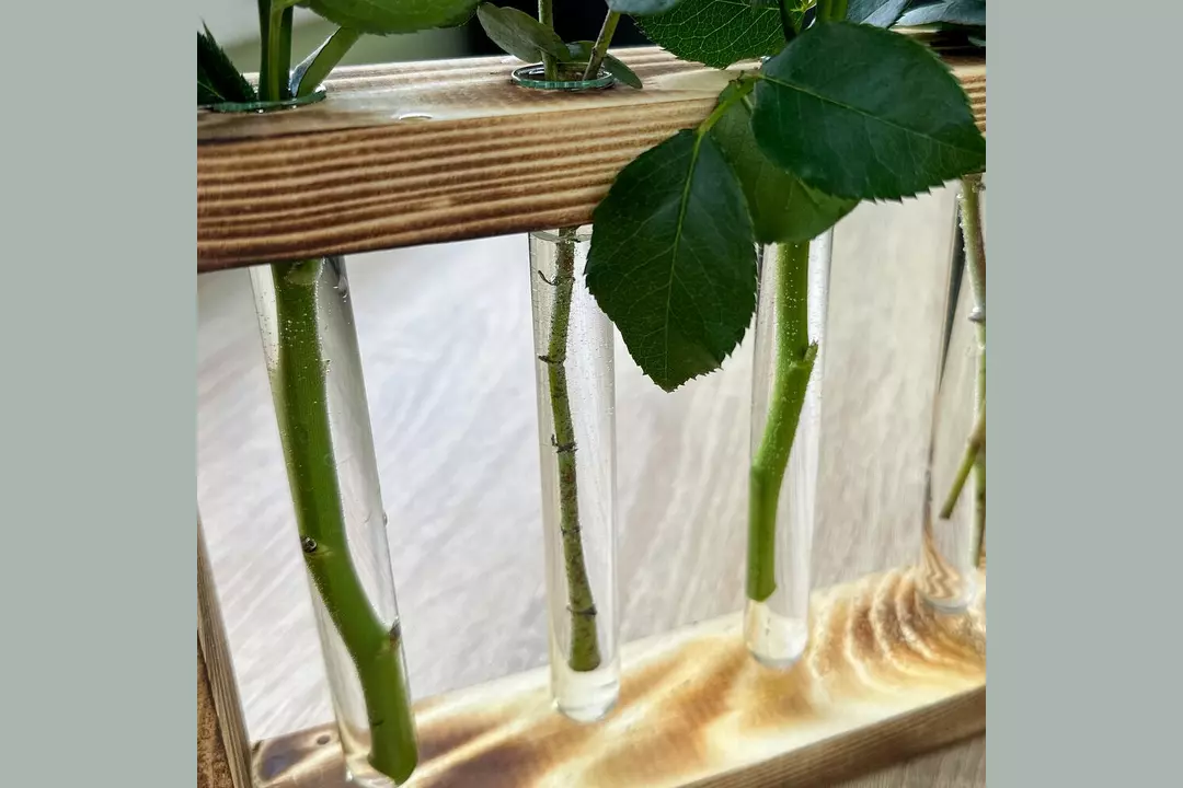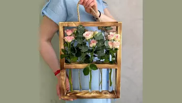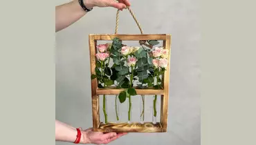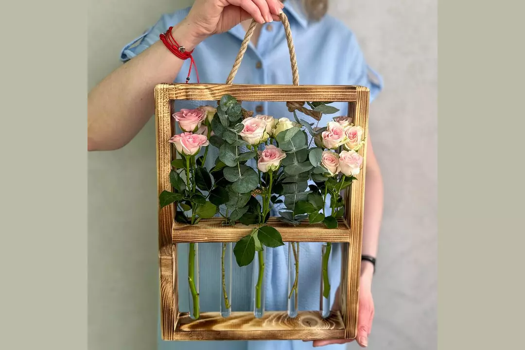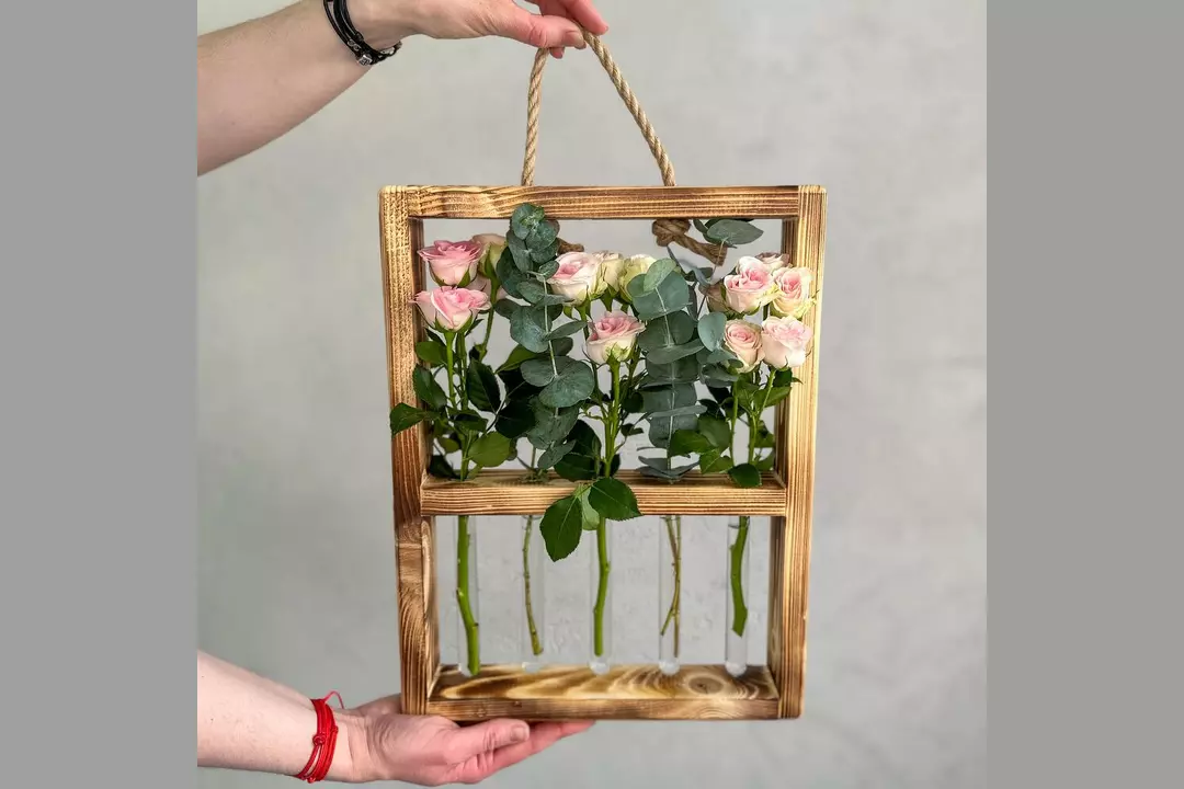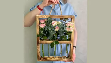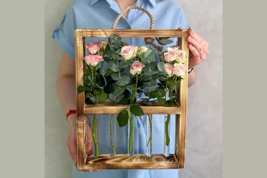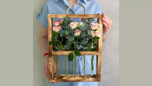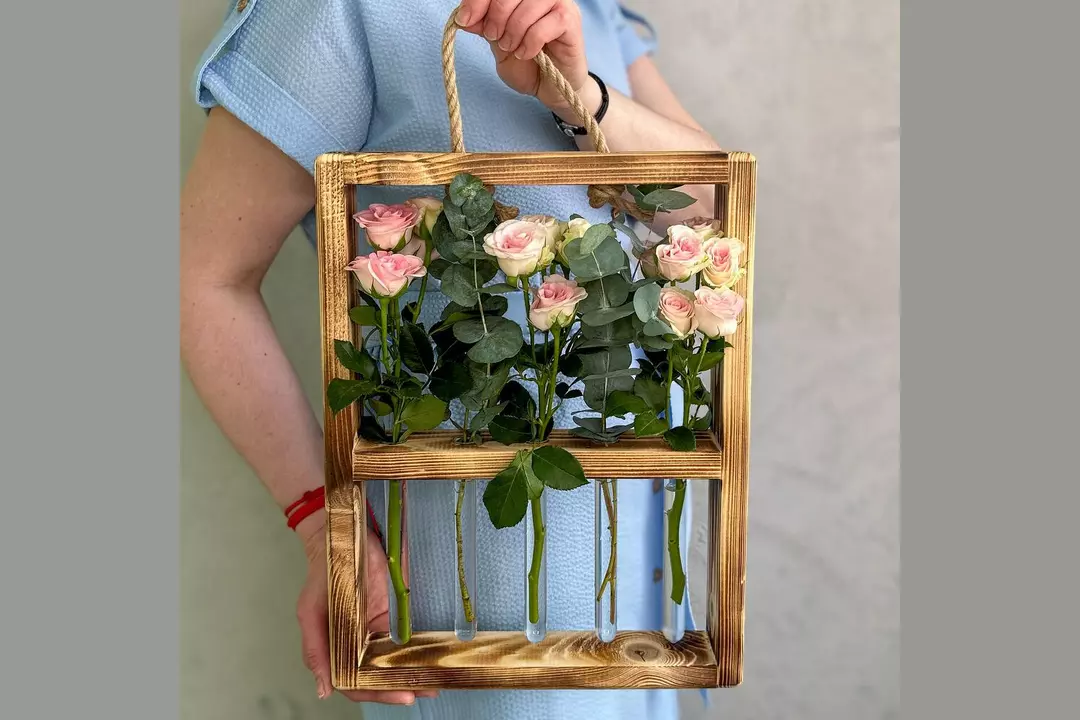 Состав Роза кустовая - 3 шт. Эвкалипт - 2 шт. рамка с колбами - 1 шт.