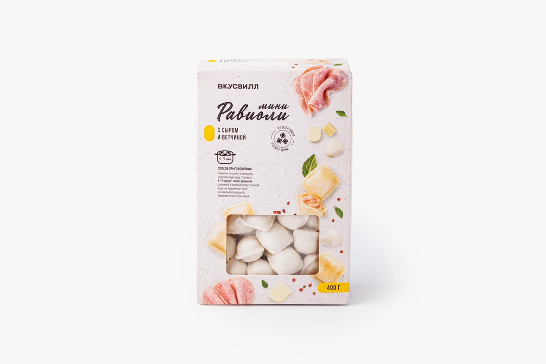 Нежные мини-равиоли с начинкой из сыра и ветчины. Сочетание моцареллы, пармезана и сливок создаёт мягкий сливочно-сырный вкус с лёгким мясным акцентом. Благодаря мини-размеру равиоли готовятся всего около 5 минут, сохраняя при этом эластичность теста. Попробуйте дополнить блюдо оливковым маслом, сливочным соусом или тёртым пармезаном. Готовим наши равиоли из натуральных ингредиентов, без соевого белка и усилителей вкуса.