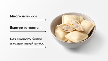 Быстро готовятся: в течение 5 минут в кипящей воде. Много начинки. Состав проверен: нет соевого белка и усилителей вкуса