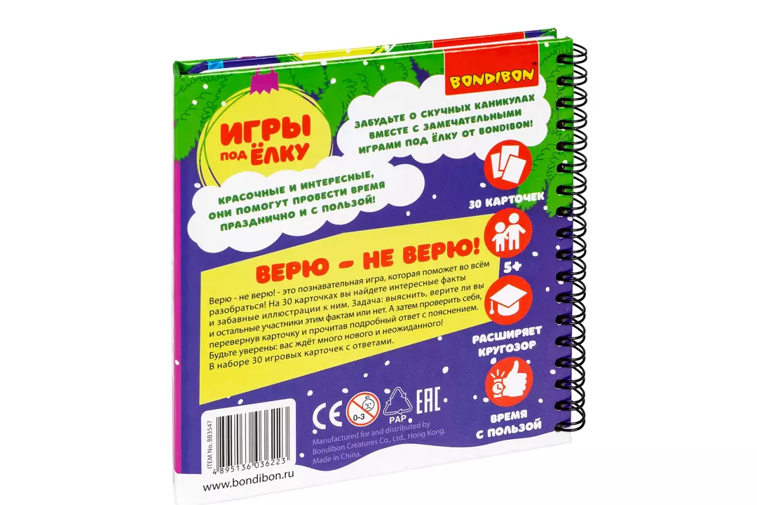 Узнай, когда день рождения у Деда Мороза, когда раньше встречали Новый год и многое другое! Компактная развивающая игра ВЕРЮ – НЕ ВЕРЮ – это набор карточек с интересными фактами и красочными иллюстрациями. Откройте книжечку и прочитайте утверждения. Ваша задача – выяснить, верите ли Вы и остальные участники игры этим фактам. А затем проверьте себя, перевернув карточку и прочитав подробный ответ с пояснениями. Игра точно не даст заскучать в праздничные дни, поможет расширить кругозор, разовьет внимание и познавательные способности. Набор многоразовых карточек в виде книжки на пружинке удобно брать с собой. В набор входят: 30 игровых карточек с ответами. Размер книжки 16х16 см. Возраст 5+ Развивающая игра ВЕРЮ – НЕ ВЕРЮ серии Игры под елку от Бондибон – интересный подарок для ребенка на Новый год! Страна-производитель КИТАЙ