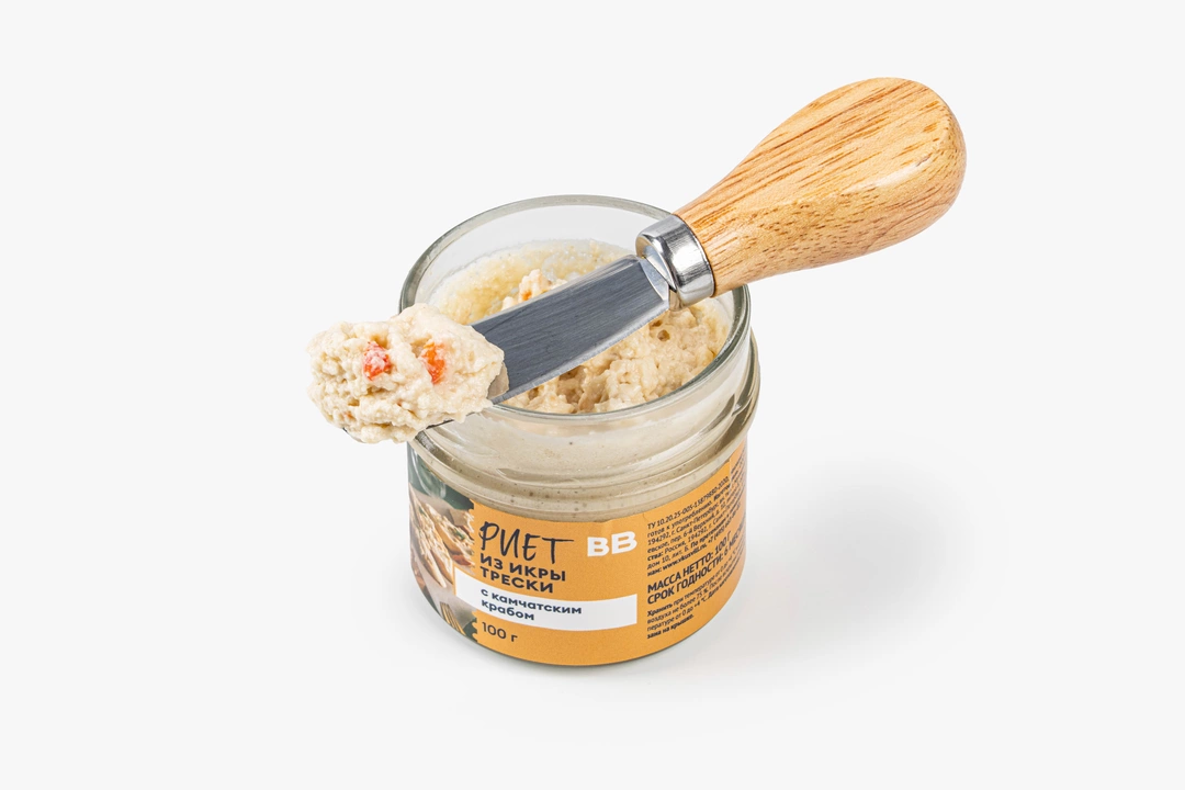 Деликатесный рыбный паштет со вкусным составом: он приготовлен из упругих икринкок трески, нежных молок красной рыбы и тающего во рту мяса камчатского краба. Лёгкий и вместе с тем питательный, с деликатным вкусом, риет прекрасно подойдёт для приготовления как привычных бутербродов, так и более изысканных закусок.