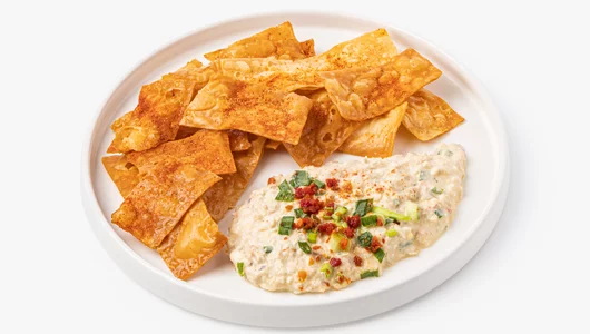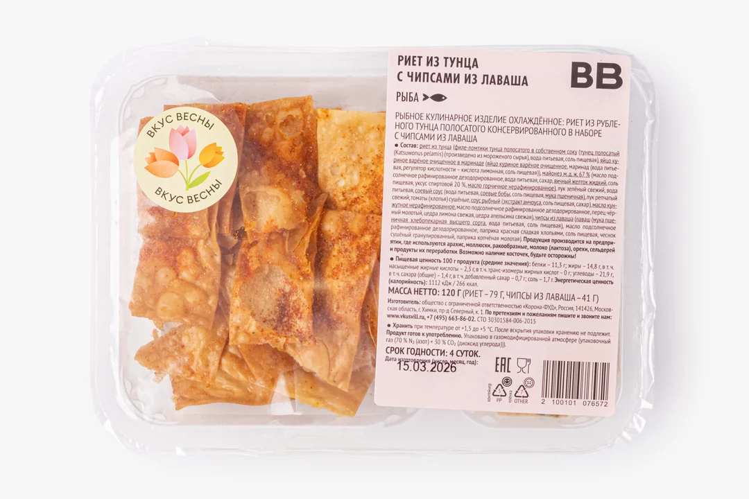 Риет — это нежная закуска, которая похожа на паштет, но в её консистенции ощущаются небольшие кусочки продукта. Этот вариант готовим из полосатого тунца в собственном соку, варёного яйца и майонеза, добавляя зелёный и репчатый лук, немного соевого и рыбного соуса, кунжутное масло, а также цедру лимона и апельсина. Сушёные томаты и чёрный перец дают лёгкую пикантность. Вкус получается насыщенным и многослойным: с мягкой рыбной основой, лёгкой солоноватостью, цитрусовой свежестью и тонким пряным акцентом. А рядом в наборе разместились хрустящие чипсы из лаваша с паприкой и чесноком — удобно макать или намазывать. Такой риет хорошо подходит для перекуса без спешки, когда хочется чего-то более интересного, чем традиционная закуска