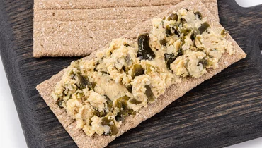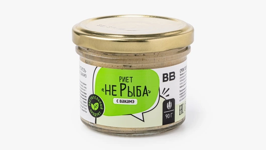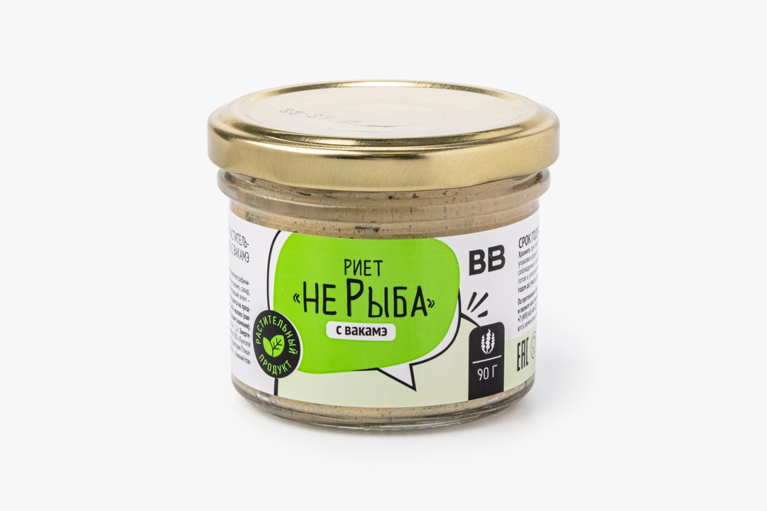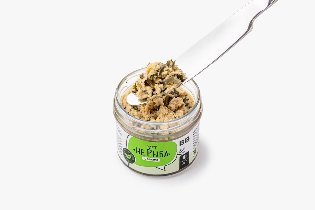 Веганский риет из соевых бобов с крупно нарезанной ламинарией и вакамэ. Его нежный вкус не имитирует рыбу, но приобретает характерные «морские» ноты за счёт большого количества водорослей. Отлично сочетается с мягким багетом и хрустящими хлебцами.