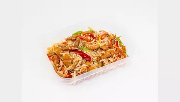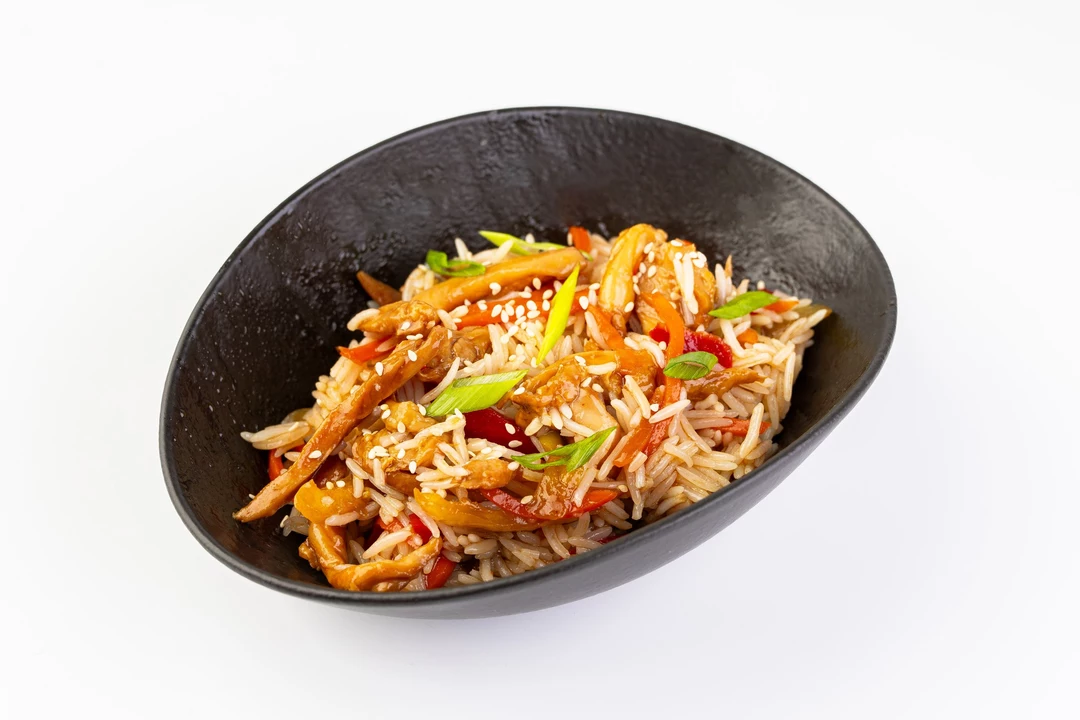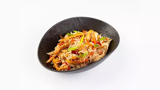 Классика паназиатского вока: сочное филе цыпленка, обжаренное до румяной корочки, подается с рисом и овощами. Главная роль здесь отведена густому соусу терияки - он карамелизует курицу, придавая ей аппетитный блеск и нежный сладко-соленый вкус с ароматом чеснока и имбиря. Насыщенный бульон и пряности объединяют все ингредиенты в сбалансированное и сытное блюдо, дополненное россыпью семян белого кунжута.