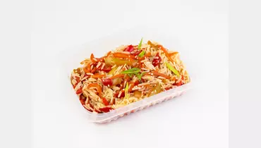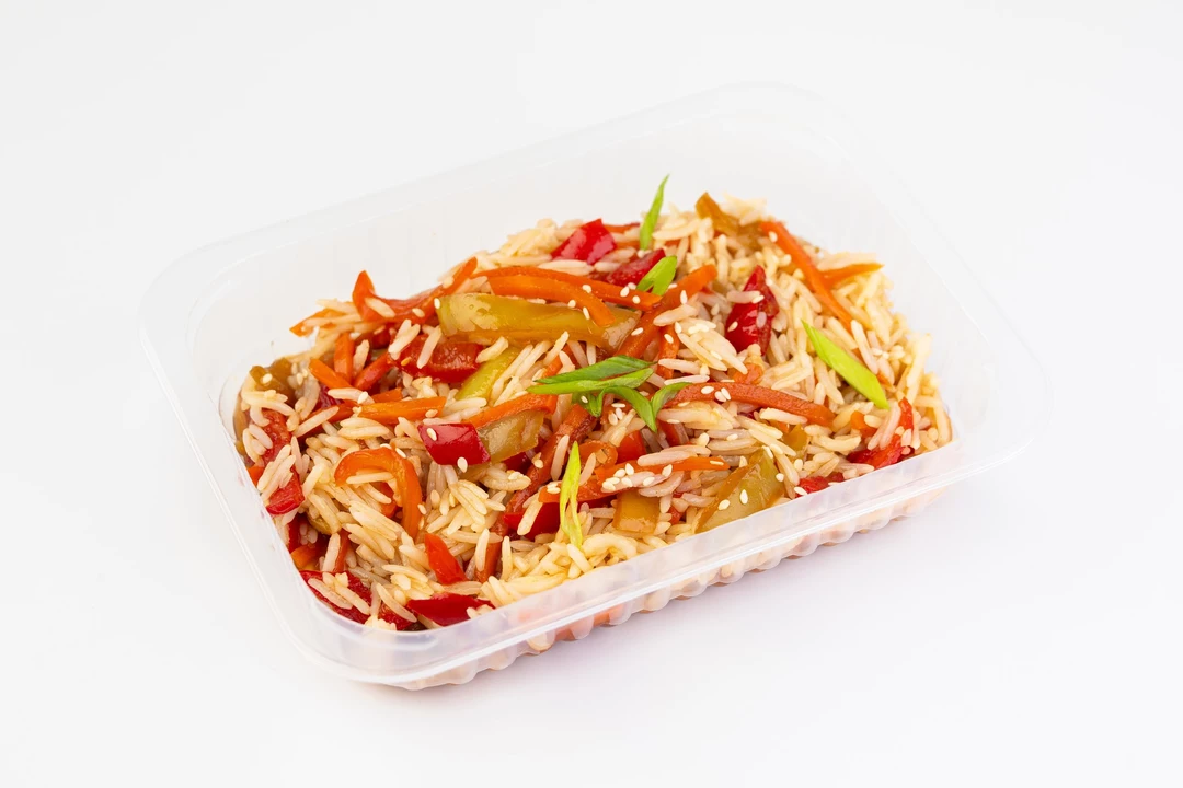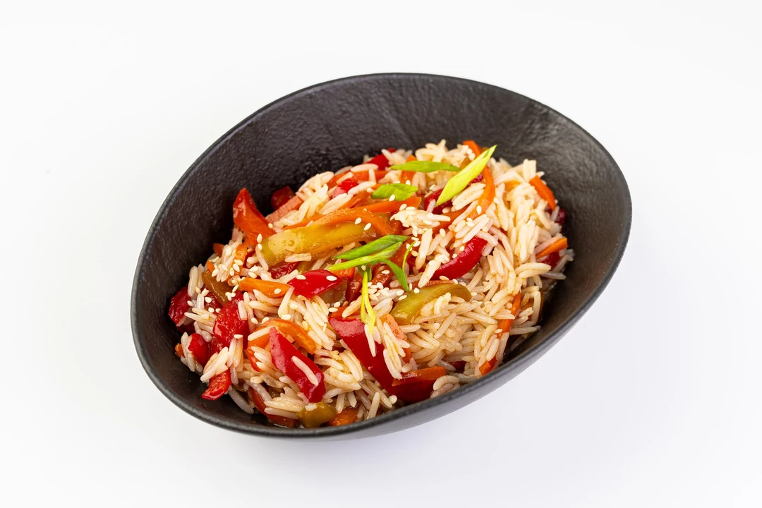 Легкость овощного микса и энергия восточных специй. Рис обжаривается с сочной морковью и болгарским перцем, сохраняя их природный вкус и текстуру. Интенсивный перечный соус и пряный бульон объединяют ингредиенты, насыщая их ароматом имбиря, чеснока и пикантной перечной остротой. Это блюдо с выразительным характером, дополненное свежим зеленым луком и россыпью семян белого кунжута.