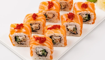 Ролл со слабосолёной сёмгой, обжаренным угрём и мягким творожным сыром. Экзотический соус из манго и ананаса добавляет ему фруктовую сладость, а тонкая томатная стружка оттеняет вкус лёгкой кислинкой.