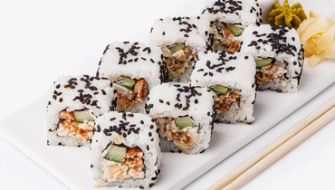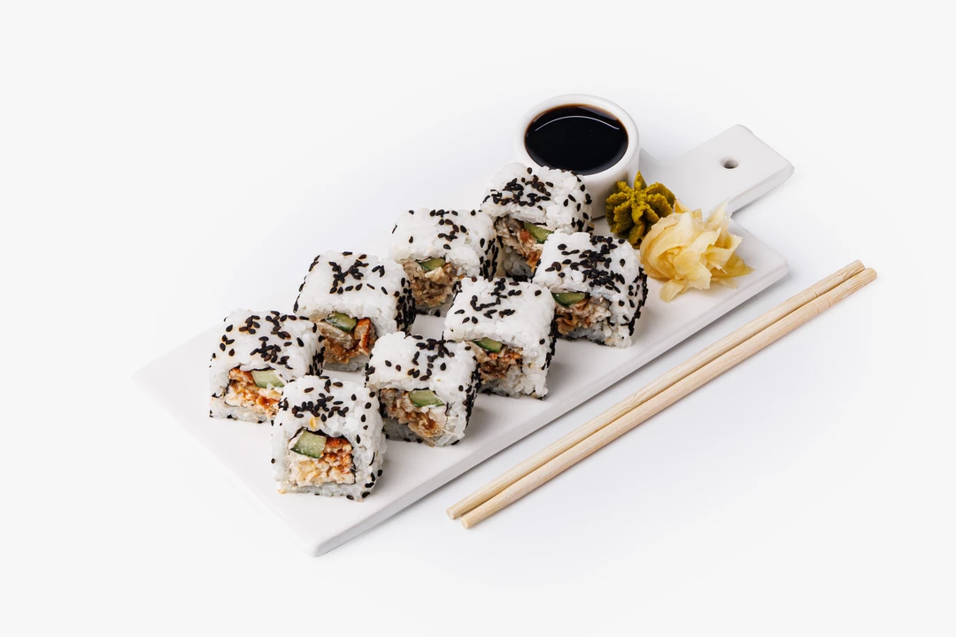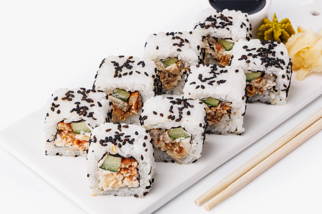 Роллы с творожным сыром, сочным угрём и свежим огурцом подаются в классическом японском стиле — с соевым соусом, маринованным имбирём и васаби. Рис с лёгкой уксусной заправкой, нори и посыпка из обжаренного кунжута создают сбалансированную текстуру. Угорь в соусе унаги даёт мягкий сладковато-дымный вкус с карамельным послевкусием, а творожный сыр делает начинку особенно нежной. Огурец добавляет хруст и свежесть, уравновешивая насыщенность рыбы. В каждом кусочке — сочетание сладости, солоноватой глубины и деликатного сливочного акцента. Подойдёт тем, кто любит роллы с мягким вкусом.