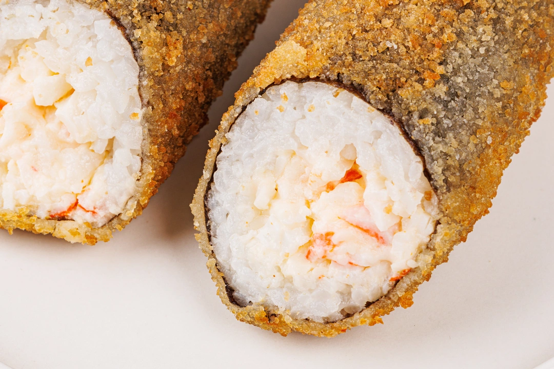 Плотный и сытный ролл в хрустящей панировке с нежным рисом, тягучим сырным соусом и «крабовой» начинкой. Внутри — сочетание мягкого творожного сыра, варёного яйца и имитации крабового мяса. Тонкие нотки чеснока и сладкого перца вносят немного пикантности во вкус ролла. Всё это завернуто в нори, обжарено до румяной корочки и уже готово к подаче. Особенно хорош с каплей соевого соуса или васаби — для выразительного финального акцента.