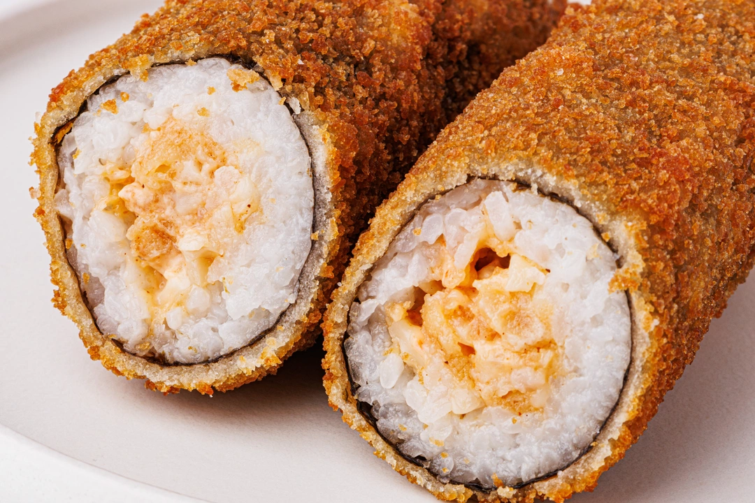 Традиционные японские роллы, приготовленные в кляре и обжаренные во фритюре. Под хрустящей корочкой из панировочных сухарей классический ролл из водорослей и риса, а внутри начинка из нежных жареных креветок с сыром. Вкус получается сбалансированным, с солоноватой нотой и мягким сливочным оттенком. Ролл можно взять с собой в дорогу или на работу в качестве перекуса, если хочется чего-то более сытного, чем обычный салат. Если добавить к обеду чашку зелёного чая, вам откроется мир оригинальных рецептов азиатской кухни с её неожиданными вкусами и сочетаниями.