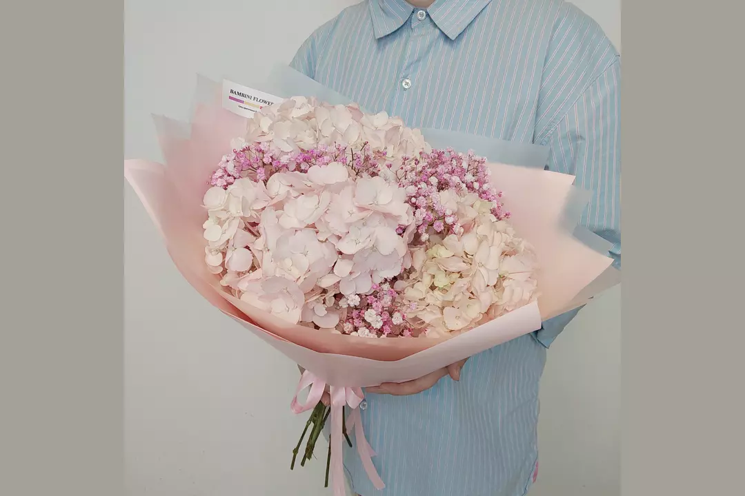 Розовое Облако - нежный букет из гортензий и гипсофил, словно окутанный утренней дымкой. Идеальный подарок, чтобы выразить самые теплые чувства. Уход: Подрежьте стебли, меняйте воду каждые 1-2 дня и избегайте прямых солнечных лучей. Bambini Flowers: С любовью к каждому цветку и заботой о каждом клиенте! Мы создадим букет вашей мечты.