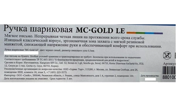 Легендарная шариковая ручка MunHwa MC Gold LE - безусловный хит продаж в ярком исполнении. Диаметр пишущего узла составляет 0,5 мм. Толщина линии письма – 0,3 мм, а длина линии письма – 1200 м. Ручки упакованы в картонную коробку по 12 штук. Ручка проработана до мельчайших деталей: шестигранный тонированный корпус диаметром 8,3 мм отлично сочетается с золотым наконечником и ребристым противоскользящим грипом для пальцев в цвет корпуса. Корпус представлен в цветах ассорти: оранжевый, салатовый, фиолетовый, голубой. Уникальные чернила на масляной основе обеспечивают мягкое, ровное письмо и уверенное скольжение по бумаге. Рука не устаёт даже при длительном письме, а тонкий шарик гарантирует качественную линию. У ручки MunHwa MC Gold LE есть возможность менять стержень, она многоразовая. Цвет чернил ручки: синий. Сочетание комфортного письма и безупречного стильного дизайна сделало её абсолютным лидером российского рынка. Страна-производитель Корея, Республика