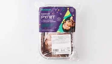 Аппетитный рулет из мяса цыплёнка-бройлера со сладким черносливом и терпким грецким орехом. Эффектный, сытный и лёгкий в приготовлении, рулет отлично подойдёт для любого случая: и для быстрого ужина, и для праздничного застолья. Способ приготовления: Достаньте рулет из упаковочного пакета. Фольгированная формочка подходит для духовки. Выпекайте до 120 минут при 180°С.