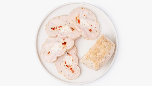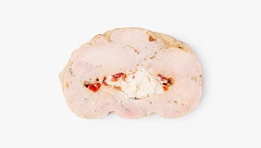 Нежный куриный рулет с мягкой текстурой и выразительной начинкой. Сливочный сыр добавляет сочности и делает вкус более мягким и сбалансированным, а вяленые томаты дают лёгкий кисло-сладкий акцент и красиво выглядят на срезе. Рулет хорошо держит форму при нарезке. Подходит для бутербродов, сэндвичей или в качестве холодной закуски на мясной тарелке.