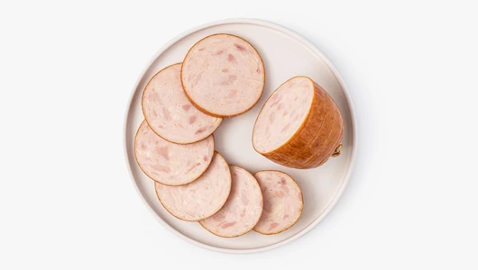 Сочный куриный рулет приготовлен из нежного мяса цыплёнка и пармезана с лёгкими солоновато-пикантными нотами. Его можно нарезать и выложить на мясную тарелку или приготовить сытные бутерброды. Продукт хорош для завтраков с тостами и в качестве начинки для сэндвичей. Его можно подавать как самостоятельную закуску или дополнить овощной нарезкой.