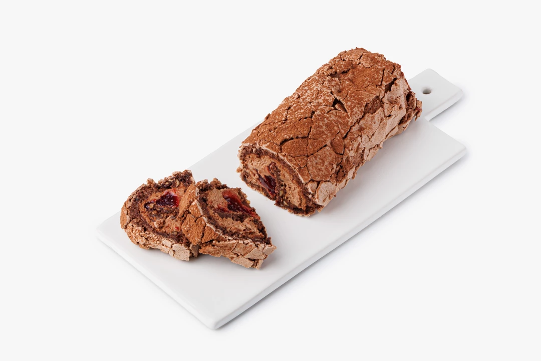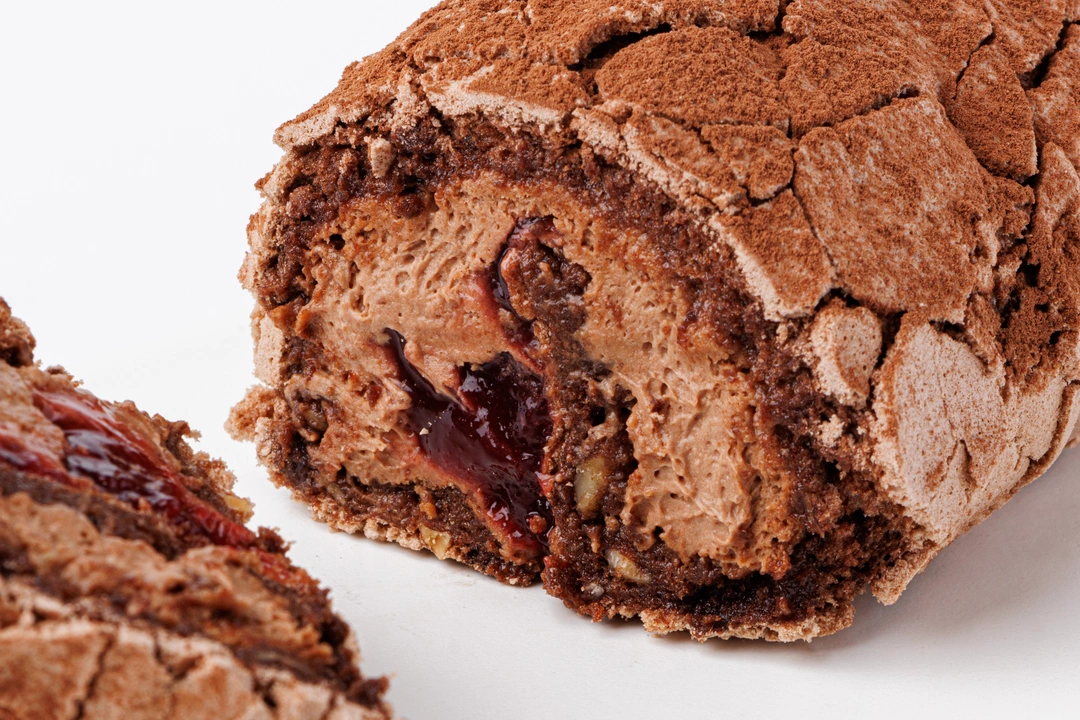 Рулет с меренгой, шоколадным кремом и вишнёвой прослойкой. Хрустящая меренга соединяется со сливочно-шоколадным кремом, а вишнёвое пюре добавляет контраст по вкусу и текстуре.