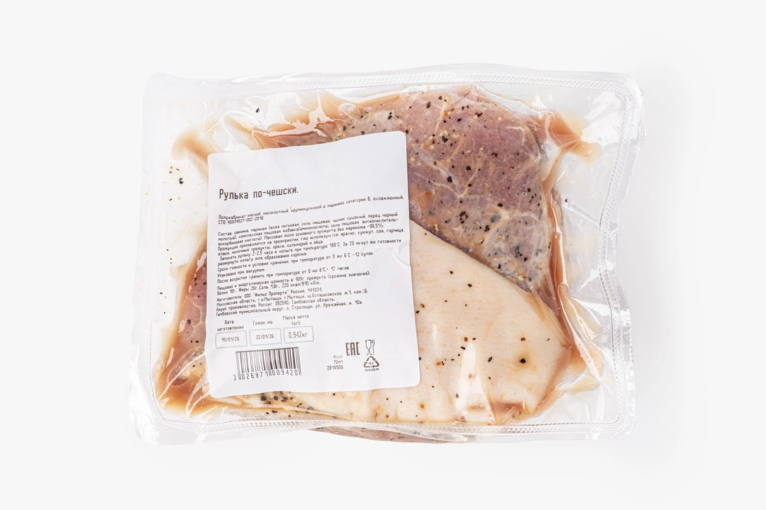 Рулька по-чешски — это нежное, ароматное и очень сочное мясо с традиционным набором приправ: солью, чесноком и чёрным перцем. Отлично подойдёт и для сытного семейного обеда, и для праздничного стола. А готовится проще простого — нужно лишь извлечь рульку из упаковки, переложить в посуду для запекания или на застеленный пергаментом противень и отправить в разогретую до 180ºС духовку на 2–2,5 часа.