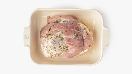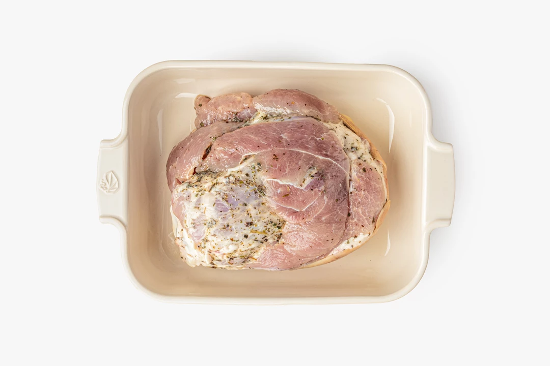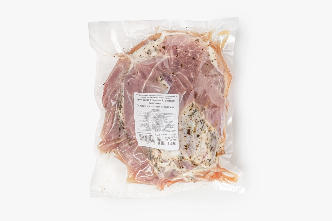 Мясистая свиная рулька на кости замаринована с чесноком, чёрным перцем и шалфеем, который добавляет пряный травяной акцент без резкой горечи. Маринад помогает мясу оставаться сочным и ароматным при запекании, а шкурка хорошо подрумянивается и становится насыщенной по вкусу. Рулька подходит для медленного приготовления в духовке — мясо постепенно размягчается и легко отделяется от кости. Хорошо сочетается с запечённым картофелем, тушёной капустой или простыми овощными гарнирами.