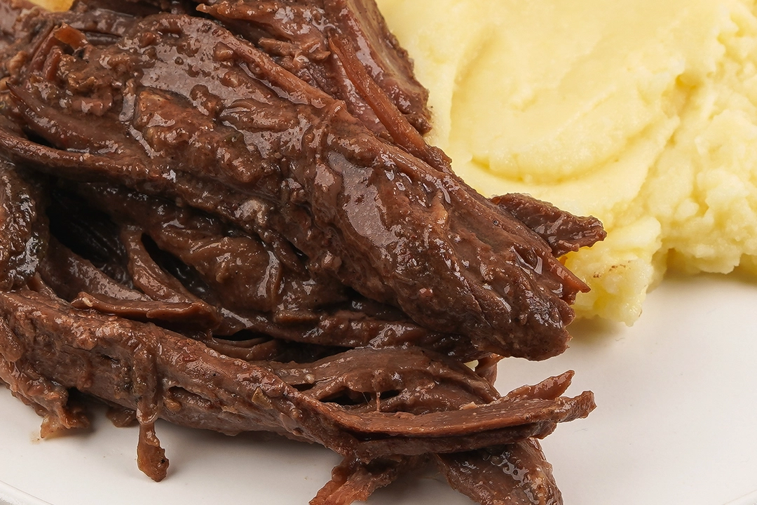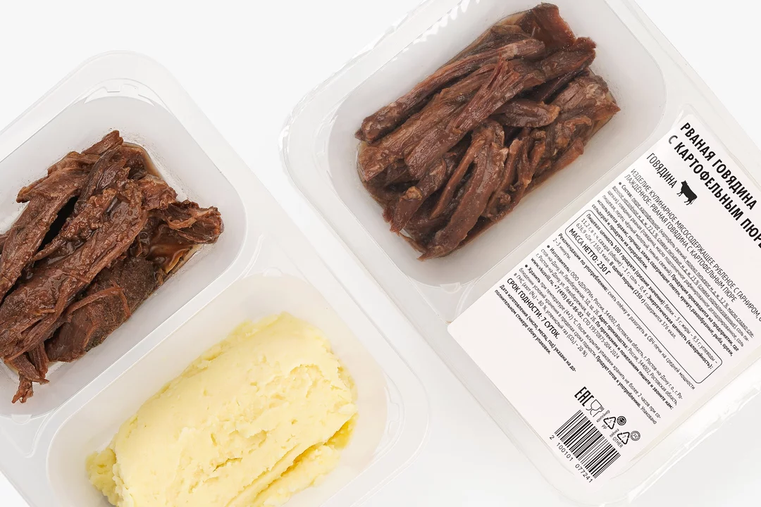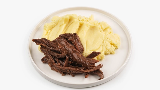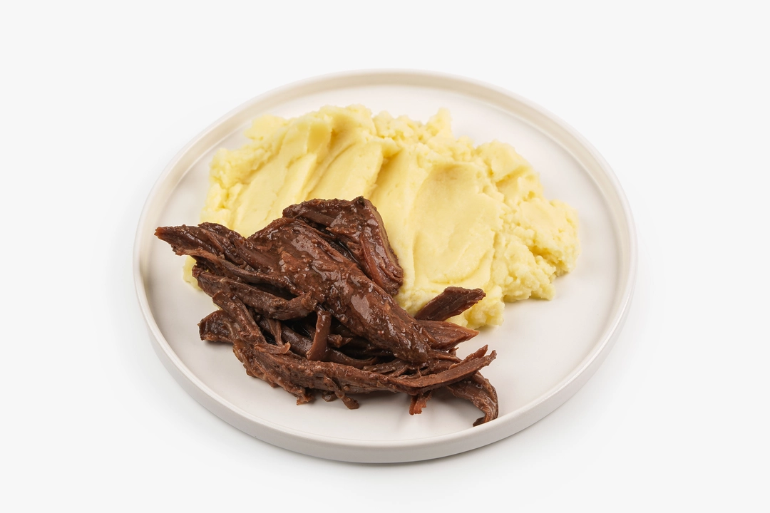 Нежная рваная говядина с лёгким картофельным пюре на сливках. Мы долго томили мясо с тимьяном и чёрным перцем, чтобы оно стало мягким и легко разделялось на волокна. Пюре приготовили на сливочном масле и сливках, чтобы оно получилось воздушным и бархатистым. Блюдо можно разогреть в микроволновой печи или на сковороде под крышкой. Это готовое сытное решение для быстрого и тёплого ужина.