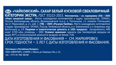 Сахар «Чайкофский» кусковой - это чистейший белый сахар категории Экстра, который производится по ГОСТ из сахарной свеклы, выращенной на плодородных почвах Тамбовской и Белгородской области. Сырье проходит многоступенчатую очистку, не содержит посторонних примесей. Цвет продукта белоснежный, однородный. Уровень природной сахарозы высокий. Удобные кусочки сахара по 5 г (1 кусочек =1 ч. ложки)! Уже более 10 лет сахар «Чайкофский» радует своих потребителей ровными белоснежными кусочками высококачественного сахара в течение всего дня. Заряжает настроением и энергией утром, придаёт силы в середине дня и дарит тепло и уют вечером в кругу семьи. Сахар «Чайкофский» -удобное решение для дома и офиса! Страна производитель-Россия